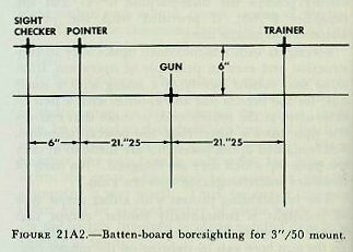 To check the sight mechanism for lost motion, set the sights so that the crosshairs are on a target whose position with respect to the gun remains fixed. Use a point on the ship itself or, if the ship is in drydock, a target outside the ship. (If the target is close to the mount, some means of removing telescope parallax, such as a focusing cap, may be required.) While this check is going on, keep the gun stationary. Set the sights at maximum range on the range scale and then return them to their original setting. If there is no lost motion, the horizontal crosshair will return to its exact position on the target. Make a similar check for the vertical crosshair by setting maximum sight deflection, returning to original deflection setting, and observing change due to lost motion, if any. If there is lost motion in the sight mechanism, it can be removed by taking up excessive play or clearance between moving parts. 21A9. Boresighting the gun To boresight in train, bring the gun to bear on the target so that the vertical crosshair of the bore-sight telescope is aligned with a vertical mark on the target. When the boresight is on, the man at the boresight calls “Mark.” If the pointer’s and trainer’s vertical crosshairs are not on target, adjust them until all vertical crosshairs are on at “Mark.” Similarly, to boresight in elevation, align the horizontal crosshair of the boresight telescope with a horizontal mark on the target. The sight checker’s telescope should also be adjusted in both deflection and elevation. After boresighting, recheck for looseness of parts. Before securing, place the muzzle disc in the gun to make sure that the boresight line of sight is still coincident with the axis of the bore. If it is not, boresighting must be repeated. 21A10. Checking parallelism of sights The check for parallelism is usually made while in a naval shipyard. Shipyards usually have available permanently constructed battens, similar to those used for boresighting but with the lines somewhat longer than necessary for boresighting only. Secure the gun in train; install and adjust the boresight; and set the sight scales at zero range (no sight angle) and no deflection. Mark the points near the bottom of the batten where the lines from the boresight and the gun-sight telescopes appear to intersect the surface of the batten board (three separate points). Next, elevate the guns and mark a point near the top of the batten where the line of sight from the boresight telescope intersects the batten. The upper and lower points for the gun determine the elevation line of the gun; run a fine piano wire between the pair of points to represent this line. From the lower points established by the pointer’s and trainer’s telescopes, mark off sight lines by stringing piano wires parallel to the elevation line of the gun. |