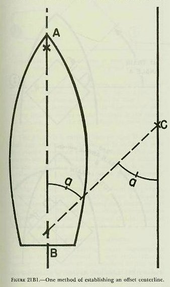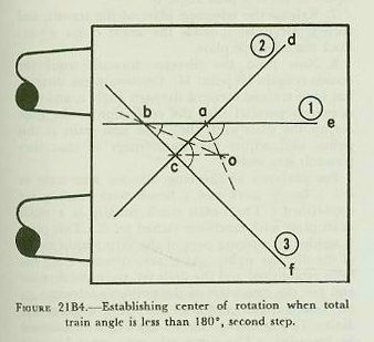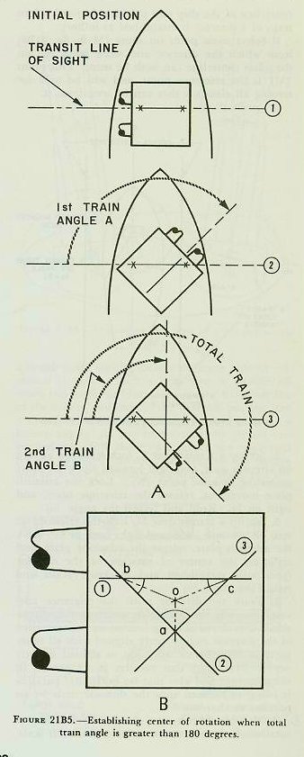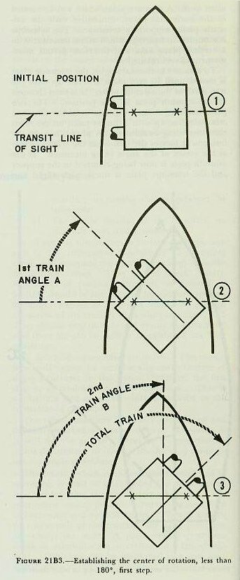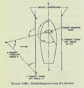 Work sheets are available which simplify the computation of angle x by logarithms. 4. Set up the transit over D and sight on C. Rotate the telescope plate through the angle x, and the telescope is then parallel to the centerline of the ship. Other points on the offset centerline may now be established as in the preceding method. 3. Establishing the center of rotation. It is also necessary to establish the center of rotation of each battery element, so that a transit may be set up over a given center of rotation to measure the true angle of train of the mount or director in question. A center of rotation may be located by using either: (1) the transit, or (2) the plumb-bob method. In the transit method, a transit is set up (on ship or ashore) at a point from which the top of the shield or mount can be seen. If the mount is of the open type, it is necessary to build a platform on which lines to determine the center of rotation can be drawn. The platform will also be needed later to support a transit at this point. With a helper stationed on the mount, sight on its estimated center of rotation and lock all motions of the transit. On top of the mount locate two points in the transit line of sight and draw a line connecting these two points. Then train the mount through two different angles, and in each case draw a line on the mount top through the transit’s line of sight (see fig. 21B3). Case 1: Sum of two train angles is less than 180°. In figure 21B4, the three original lines on the mount top are designed as 1, 2, and 3. Draw the bisector of the interior angle of the triangle formed by the first and third lines. In the figure this is ob, the bisector of angle cba. Next draw the bisector of the exterior angle of the triangle formed by the first and second lines. In the figure this bisector is ao, and the angle is cae. Finally, draw the bisector of the exterior angle formed by the second and third lines. In the figure this bisector is co and the angle is acf. The intersection of these bisectors is the center of rotation, o. Case 2: Sum of the two train angles is greater than 180 degrees. As shown in figure 2lB5, the three original lines are labeled as in Case 1. Note also that the intersection of the bisectors of each of the interior angles of the triangle is the center of rotation, o. In the figure these bisectors are oa, ob, and oc. The plumb-bob method can be used if a structure not attached to the mount is available over the mount. Suspend a plumb bob from this structure so that it hangs close to the center of rotation. As the mount is trained the plumb bob will describe a circle, the center of which is the center of rotation. After a center of rotation has been determined, it should be checked by sighting from a transit to assure that this calculated center does not move out of the transit line of sight when the mount is trained. The center of rotation should then be permanently marked for future use. 21B3. Establishing zero train-director The first step in effecting actual alignment in train is the establishment of zero train; that is, setting the train dials of each element so that when these dials read zero train the light of sight or bore axis of the element in question is parallel to the centerline of the ship and pointing forward. Zero train of a director is established as follows: 1. Select some point on shore (M in fig. 21B6) from which the director and some point (C) on the offset centerline can both be seen. This point (M) is the reference point, and will be used for zeroing all elements that can be seen from it. 2. Set up a transit over C, lock telescope at zero on azimuth scale, and sight forward along the offset centerline at some point (N). Lock the azimuth plate movement, release the telescope plate, and sight on M. Read and record the angle (a). 3. Set up a transit over M, lock the telescope at zero on azimuth scale, and sight back at C. Lock the azimuth plate, release the telescope plate, and sight on the center of rotation of the director (previously established and marked). Read and record this angle (b). 4. Train the director until the reference telescope (usually the pointer’s), which in this discussion is considered as being located on the centerline of the director and properly aligned with all other parts of the director assembly, is sighted directly on I\f. Make sure that parallax is not present in the telescope, and also that no horizontal parallax is being introduced into the director dials by its parallax mechanism. 5. Set up a transit over the director’s center of rotation, lock telescope at zero on azimuth scale, sight back at point M, and lock azimuth plate. Now both the transit and the reference telescope are sighted on M. 6. Study of figure 21B6 shows that the director and the transit are trained from the true fore-and. aft direction by the angle e. This angle (e) is equal to angle a plus angle b. 7. Release the telescope plate of the transit, and turn it aft until it reads the angle e (or a + b). Lock the telescope plate. 8. Now train the director forward until the transit is again on point M. Obviously, the director has been trained forward through angle e, and now is exactly parallel with the centerline of the ship. Adjust the dials until they read zero train at this point, and adjust the transmitters so that they transmit zero train. For purposes of checking director zero train at sea, a bench mark and a bench-mark reading are established. The bench mark usually is a small brass plate with crosslines etched on it. This plate is welded to a secure part of the ship within vision of the director sights. After zero director train has been established and the dials set, train the director and put the crosswires of the pointer’s telescope on the bench mark, and read the train angle-reader dials. This is the benchmark reading which should be recorded. The same telescope must be used for obtaining all settings and readings. On multiple director inst