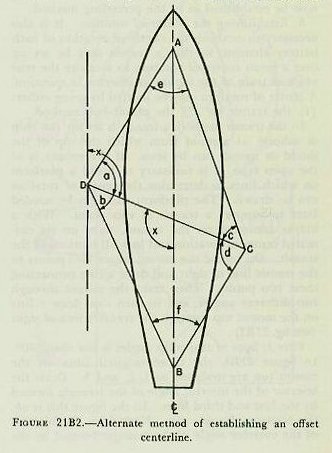 If there can be found on the actual centerline of the ship two points which are visible from each other, the procedure which follows is quite simple (refer to fig. 2lBl). 1. Set up a transit over B, one of the points on the centerline. Lock the telescope plate at the zero point on the azimuth scale and sight on the other point, A, on the centerline. Clamp the azimuth plate to the transit support. 2. Select some other point on shore through which the offset centerline is to be established, such as C. (Either side may be used.) Unclamp the telescope plate from the azimuth plate and sight on point C. Read and record the corresponding angle, a. 3. Then set up transit at C. With the telescope set on zero azimuth and locked, sight back on B. Lock the azimuth plate at this position. Then release the telescope plate, set it at an angle a, and lock. The transit telescope is now pointed parallel to the centerline of the ship. 4. Establish other points in the offset centerline by setting up stakes in the line of sight of the transit. If no two points can be found on the ship’s centerline which are visible from each other, the following method must be employed: I. Select two points; one on either side of the ship (C and D), which can be seen from each other and also from two points on the centerline (A and B). (See fig. 21B2.) 2. Set up the transit over A, B, C, and D in turn, and measure angles a, b, c, d, e, and f. 3. The value of angle x may then be computed, using the data obtained in step 2. The following formula may be used in making this comparison: |