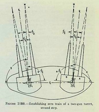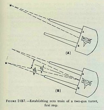B. Train Alignment in Drydock 21B1. Train alignment in drydock The purpose of the train alignment is to adjust the battery so that the lines of sight of directors and guns and axes of gun bores are parallel at all angles of train when no ballistics or horizontal parallax are considered and the dials are matched. This is accomplished initially by aligning each element to the centerline of the ship, which is the line of 0° train. Space limitations will not permit full discussion of all alignment procedures applicable to specific installations, for these installations are many and varied. The following discussion is limited to general procedures and principles used for batteries of 5-inch guns or larger, without reference to particular systems. |
