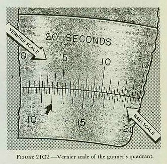 The gunner’s quadrant Mark 3 Mod 1 (fig. 21C1) consists of a base, the bottom of which is ground to an accurate plane surface, an arc mounted perpendicularly on the base, an arm containing a spirit level, and a clamp arm. The level arm and clamp arm are pivoted to the arc. The clamp arm serves to secure the level at any particular position on the arc by means of the clamp screw. The clamp arm is connected to the level arm by a tangent screw for making fine adjustments between the clamp and the level. The level in the level arm is a slightly curved graduated glass tube filled with colored alcohol and containing an air bubble. The upper surface of the glass tube is graduated so that the bubble can be accurately centered. The level arm also carries the vernier scale, which slides along the arc, and a magnifier glass. The glass vial containing the spirit level is enclosed in a metal tube with only five inches of its upper surface exposed. The glass is graduated in units of ten seconds (10”) of arc. The main scale is 100° long, and its smallest graduation (fig. 21C2) is 15 minutes (15’) of arc. (In some mods, the degrees are divided into six parts of 10 minutes of arc each.) Each main division of the vernier scale represents 5 minutes, and the next smaller graduations represent minutes. The smallest graduations represent 20 seconds of arc each. To use the gunner’s quadrant, place it carefully on a flat surface parallel to the axis of the gun bore or other object to be measured, and with the quadrant pivot toward the gun muzzle. Bring the level bubble approximately to the center of the bubble tube by adjusting the clamp arm and level arm positions on the arc. Tighten the clamp screw to hold the arms in position. Then turn the tangent screw slowly in the proper direction to bring the bubble exactly into the center of the tube. Then read the measured angle from the arc and vernier scales. In reading the scale, count along graduations on the arc scale to the zero on the vernier. This will give a ROUGH reading in degrees and minutes. To get the fine reading, count from the zero on the vernier scale up to the division on the vernier scale that lines up exactly with a division on the arc scale. This will give the fine reading. Add the course and fine readings together to get the total angle of inclination. In figure 21C2, the indicated value is 9° 18’ 40”. This is read as follows: 1. The zero on the vernier falls between 9 and 10 on the main scale. The smallest graduations on the main scale are 1/4° or 15’ apart. Since the zero graduation on the vernier falls between the first and second small graduations above the 9° graduation (which is not visible in the detail view of figure 21C2), the coarse reading must be 9°15’. |