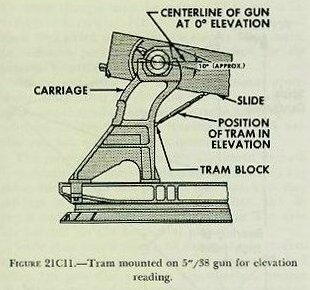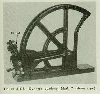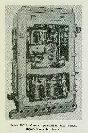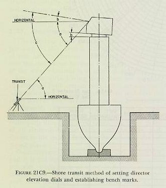 C. Elevation Alignment in Drydock 21C1. Purpose of alignment in elevation A battery is aligned in elevation after it has been aligned in train. The purpose of alignment in elevation is to adjust the battery so that at any angle of train and elevation the lines of sight of directors and guns and the bore axes will all be elevated at exactly the same angle above a common reference plane, provided that no vertical parallax is introduced, no ballistics are considered, and the dials are matched. Before undertaking elevation alignment, each element involved should be properly adjusted, and a transmission check should be completed satisfactorily. There is an appreciable change in the shape of a vessel between drydocked and afloat conditions.(1) While the taking of elevation alignment data when the ship is in drydock is described here, these data cannot be used to effect a final operating alignment afloat, because of the change in the shape of the ship and the consequent shifting of the relative positions of the various elements of the battery. Therefore the battery must be realigned when the ship is waterborne. (1) Battery alignment is usually done with just enough water pumped out of the dry dock so that the hull rests firmly on the blocks; this condition is known as partia11y waterborne. 21C2. Gunner’s quadrant To obtain data for elevation alignment, use must be made of a gunner’s quadrant. The gunner’s quadrant is an instrument which measures the angle between its own base plate and the horizontal. The correct use and reading of a gunner’s quadrant are rather difficult; accurate results can be obtained only after considerable practice. The following suggestions will prove helpful: 1. When using the quadrant, see that it rests firmly on a smooth surface, but do not clamp it to the surface so tightly that the quadrant becomes distorted. 2. Make sure the arc of the quadrant is properly positioned; c. g., if the elevation of a gun at a given bearing is to be measured, place the quadrant so that its arc is parallel to or coincides with the vertical plane through the axis of the bore. 3. Bring the bubble approximately to the center by sliding the arm along the arc; then clamp the arm. 4. Center the bubble carefully by means of the fine adjustment screw, allowing sufficient time for it to come to rest. 5. In any series of observations have one man use the quadrant for the entire set of readings. Two types of gunner’s quadrants are in use at the present time: the vernier type (Mark 3 Mod 1) and the drum type (Mark 7). |