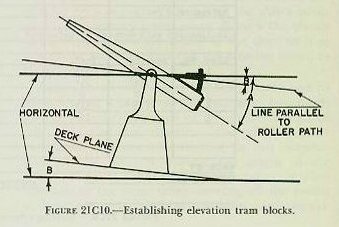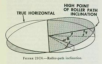 In all modern installations, it is assumed that the roller paths of all elements are true planes or so close to true planes that distortion is unimportant and not measurable. The relationship between a tilted plane and the true horizontal plane is shown in figure 2lC4. It can be proved that the tilt (t) of the roller path at any point is equal to the maximum value of the tilt (T) between the planes (i. e., the tilt at the high point of the roller path) times the cosine of the train angle (B) between the high point and the point under consideration. Therefore the readings obtained at points through the training limits of the element should vary in a sinusoidal manner, with some readings above and some below the horizontal. If they do not vary in this way, it is evident that the roller path has become distorted. |