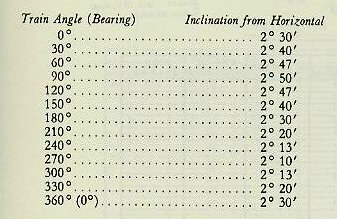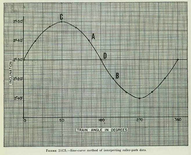 21C4. Interpretation of roller-path data The relationship between any roller path and the horizontal is defined by the amount of tilt at the highest point of the path and the bearing of this point, and compensating devices are built to correct in these terms. Therefore in order to interpret the results of these two quantities must be determined for each roller path. There are two commonly used graphic methods available for this determination: the sine-curve method and the 60° radial method. In order to explain these methods more clearly we shall assume a set of typical roller path data shown below, and actually find the high point and its bearing by these methods. Although the following table shows inclination at 30° intervals of train, in actual practice, readings would be taken every 10° or 15°. Note that all readings are positive. This is due to the fact that the quadrant was slightly elevated, mentioned before, to avoid the complication negative numbers. |