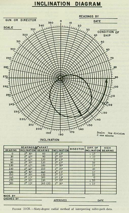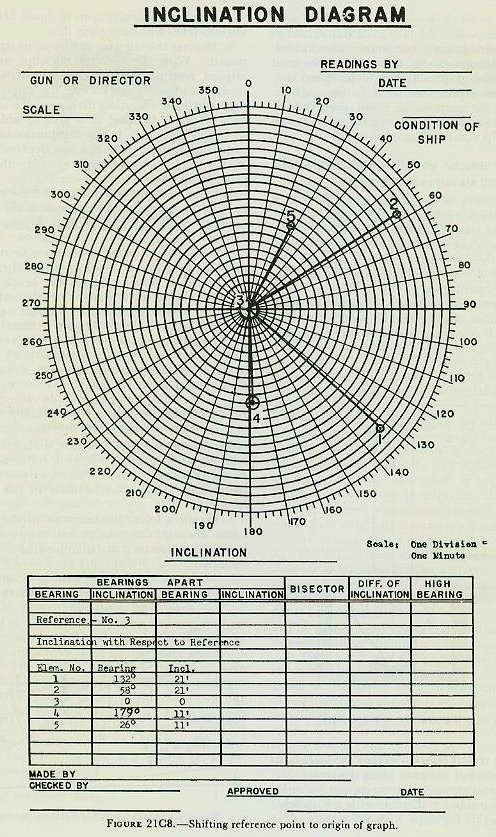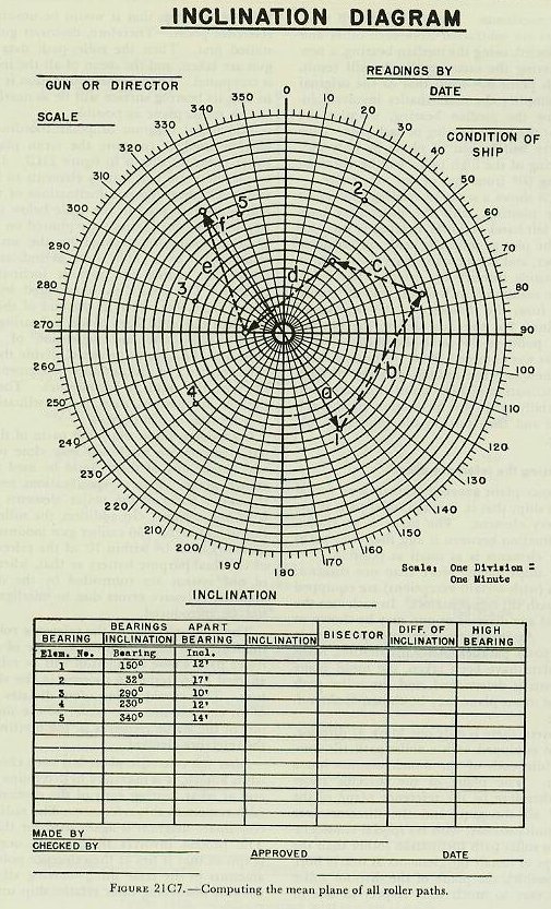 Figure 21C6 shows a series of readings 60° apart arranged for plotting, with the differences indicated. The left-hand or lower bearing is used for plotting. The plot as shown is made on polar coordinate paper, and our new sine curve will appear as a circle passing through the origin. The diameter gives the maximum inclination, and 60° counterclockwise from the diameter is the bearing of the high point. For the data shown, the bearing of the high point is 90° and the inclination is 20 minutes, as was obtained above in the sine-curve method. These are the settings-bearing of high point and inclination of high point-that are combined vectorially with the inclination of the reference plane and then put on the roller-path tilt compensator. 21C5. Choosing the reference plane The reference plane generally chosen is an actual plane on the ship; that is, it is the roller-path plane of one battery element. The plane is so chosen that the inclination between it and the roller paths of the other elements is as small as possible. On larger ships having more than one director, the directors (with certain exceptions) are equipped with roller-path tilt compensators. In such case the roller path of any director or gun may be chosen as a reference. At installation an attempt is made to make all paths parallel. After installation, when roller-path data have been taken, the mean plane of all elements is determined, and the roller path closest to the mean plane may be chosen as the reference plane. On destroyers, there is only one Mark 37 director, and it is not equipped with a roller-path tilt compensator, while each of the 5-inch mounts has a compensator. The plane of the director roller path must therefore be the reference plane of the battery. If all the guns and the director were installed simultaneously, with no special consideration given to roller-path inclination (other than the usual attempt to install the elements as nearly horizontal as possible), the plane of the director roller path might vary so much with respect to one or more of the guns that it would be unsuitable as a reference plane. Therefore, destroyer guns are installed first. Then the roller-path data for each gun are taken, and the mean of all the inclinations is computed. The director foundation is machined so that its bearing surface will be as nearly parallel to this mean plane as possible. The radial diagram or polar coordinate graph may be used to compute the mean plane of all roller paths, as shown in figure 2lC7. In this example there are five battery elements to be considered. The bearings and inclinations of their high points are indicated in the table below the graph. Bearings and inclinations are plotted on the radial diagram, being represented by the small circles numbered 1 to 5. The sum, as indicated, is obtained by adding the various inclinations vectorially. The resultant, represented by the line drawn from the center to the end of the last line (e) gives the solid line (f) on a bearing approximately 326° with an inclination of about 16 minutes. To obtain the mean, divide the total inclination (16’) by the number of elements (5). In this case the result is 3.2 minutes. The mean of the five inclinations, then, is an inclination of 3.2’ at a bearing of 326 degrees. On modern ships, the roller paths of the individual elements are machined very close to parallel, and almost any of them could be used as the reference plane. Present specifications require that the roller paths of the major elements be within 6’ of one another. In addition, the roller paths of the 40-mm and 3”/50 caliber gun mounts and their directors must be within 10’ of the reference plane of the dual-purpose battery so that, when the guns of one system are controlled by the director of another, excessive errors due to misalignment will not be introduced. The final selection of the reference roller path is influenced by the obvious advantage of choosing a roller path whose inclination will be relatively unaffected by waterborne changes in the ship’s structure. This consideration often dictates the choice of an element near the center of the ship, such as one of the stable elements in the plotting room, as the reference element. After the reference plane has been chosen and its tilt is known, it is necessary to determine how much and at what bearing each of the elements is tilted with respect to this reference. The radial or polar coordinate diagram is again used for this purpose. The process involves shifting the origin of the graph so that it lies at the reference point, or what amounts to the same thing-moving all the points without disturbing their relationship until the reference point lies on the origin of the graph. Figure 21C8 shows the points of figure 21C7 transferred so that element No. 3 is the reference. The inclination of any element to this reference can be read directly from the graph. It should be noted that the inclinations represented in this diagram have been assumed for purposes of illustration; lack of parallelism to such a degree is rarely encountered in modern ship construction. 21C6. Setting director elevation dials and establishing elevation bench marks The bench mark is established to be used as a reference in checking director sights and dials at sea. The shore transit method is as follows: 1. Train the director to either the high or the low point on the roller path. This is done so that the true tilt of the director may be obtained easily from the roller-path data. 2. Vertical parallax correctors must not be operating or parallax range must be set for infinity. The roller-path compensator should be set at zero inclination. 3. Level the transit (ashore) so that the level bubble under its scope is centered when the stadia (elevation) circle reads zero. Illuminate the pointer’s telescope from inside the director with a flashlight, and sight into this telescope with the transit. 4. Read angle a, as shown in figure