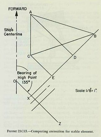 21C7. Setting gun elevation dials and establishing elevation tram marks To ensure that gun elevation dials will read the true elevation above their own roller paths, it is necessary to set the dials to proper position while in drydock. This may be done in the following four ways: 1. Install a boresight telescope in the gun, and follow through the same process that was used for setting the director’s dials, employing a transit set up ashore. 2. Make sure that the gun is properly boresighted, and set sight angle and deflection at zero on the gun sight. The procedure is then the same as in No. 1 except that the transit is sighted on the gun sight rather than the boresight telescope. 3. Set up a gunner’s quadrant on the gun as when taking roller-path data. Train the gun to the exact angle at which roller-path inclination was read (roller-path data). Elevate the gun to any convenient angle and read the quadrant. Referring to figure 2lCl0, it is evident that the quadrant has read the angle A between the gun bore and the true horizontal. However, the roller path is inclined to the horizontal by the angle B. Hence, the true angle of gun elevation is A-B, it the roller-path inclination is positive (as in fig. 21C10) and A +B, if the roller-path inclination is negative. Set the dials so that they read this value of A plus or minus B, as appropriate. 4. Set up a gunner’s quadrant as in No. 3. Train the gun 90° away from the high point of the roller path; thus eliminating roller-path inclination. Elevate the gun, read the quadrant, and set the dials in accordance with the quadrant reading. After the dials have been set, the train blocks are installed. The method used for installing train tram blocks described in article 21B5 is used for elevation tram blocks, except in the latter case one block is on the carriage and one is on the slide, as shown in figure 21C11. With the tram in position and its index marks lined up, the elevation-dial reading is recorded for use as a future check for proper elevation reading. 21C8. Dial accuracy check A dial accuracy check in elevation is made for the same purpose and using the same basic principles as the train dial accuracy check. It will be more convenient to use a gunner’s quadrant, however, to measure actual movement of the mount for comparison with the dial indication thereof. In the case of a director, the quadrant must be mounted on some surface, such as may be found on the rangefinder, that moves exactly with the line of sight in elevation. 21C9. Alignment of the stable element After the reference plane of the battery has been established, it is necessary to align the stable element or stable vertical so that the plane of rotation of its sensitive element is parallel to the reference plane. Of course, if the plane of one stable element is used as a reference plane, it will still be necessary to align any additional stable elements. The sensitive element is trained in accordance with director train and not in accordance with relative bearing in the horizontal plane. Its roller path, therefore, must be parallel to the reference plane, so that director train will produce the correct train of the stable element gimbals. Since these instruments are not equipped with roller-path tilt compensators, they must be aligned by shimming. Two methods are available for aligning the stable element with the reference plane. Since the first of these two is invariably used with all late marks of stable elements and stable verticals, the second will not be discussed; it can be found in Bureau of Ordnance publications if required. With modern instruments the first step is to take roller path data with a gunner’s quadrant mounted on the crosslevel gimbal-mounting bracket. (See fig. 21C12.) These data are plotted in the same manner as for other battery elements, and the bearing and inclination of the high Point of the stable-element roller path with respect to the reference plane are obtained. The number, thickness, and location of the shims needed to effect alignment is determined as follows: 1. On a plain sheet of paper draw a vertical line representing the ship’s centerline (see fig. 2lCl3). Draw a triangle, ABC, representing the three mounting legs of the stable element drawn to scale and in their correct relationship to the centerline of the ship. In the example, the scale is 1/8 inch equals 1 inch, and the legs are drawn so that the single leg is to starboard. 2. From any point O in the line representing the ship’s centerline, draw a line OZ at the bearing of the high point (with respect to the reference plane) of the stable element’s roller path. In the example, it is assumed that the high point is on bearing 135° and that its inclination is 15 minutes. 3. Drop a perpendicular BX, from the vertex of the triangle in the direction of the stable element’s high point, to the line OZ. 4. Drop perpendiculars, AD and CE, from the other two vertices of the triangle to line BX. 5. Measure the lengths of AD and CE and convert, according to scale, to the lengths represented. In the example, the length represented by AD is 25½ inches, and that represented by CE is 12 1/2 inches. 6. Enter these lengths in the formula S=0.0003 LT, in which S is the amount of shimming needed under the leg, L is the length represented by the line dropped from that leg in the diagram, and T is the tilt of the roller path at its high point in minutes. In the example, leg A will require shims of 0.115 inch; and leg C, of 0.056 inch. Note that, in any case, only two legs will require shims. After shims of the proper thickness have been placed, the taking of roller-path data should be repeated. If the new readings show a variation from the reference plane of as much as 2 minutes at the high point, the calculation and shimming should be repeated. (Extreme care should be exercised after the shims are inserted. The holding-down bolts are tightened evenly with a torque wrench to prevent cant