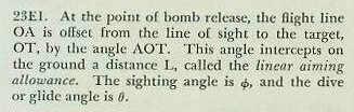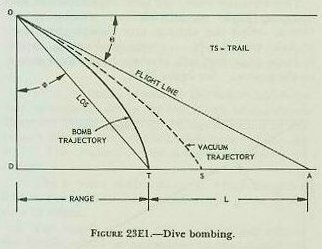| E. Other Bombing Problems 23E1. Dive bombing In dive bombing the plane descends toward the target at an angle of 60 degrees or more, thus imparting considerable vertical velocity to the bomb at the moment of release. In a steep dive, with the bomb released at 2,000 to 6,000 feet, time of flight is short and air resistance, wind, and target motion are small. The problem of obtaining accuracy is simplified and a good percentage of hits can be obtained by use of a simple lead-computing sight. A fixed sight and rule-of-thumb methods may also be used. The plane makes a good AA target, particularly as it pulls out of its dive. In recent aircraft, structural stresses are not too great and a large payload can be carried. Also advantageous is the adverse psychological effect on enemy personnel. 23E2. Glide bombing Glide bombing is similar to dive bombing except that the attack angle is less than 60 degrees. This technique is better adapted to fighter-type aircraft which tend to develop excessive speeds in steep dives. Glide bombing is high-speed attack and bombs are released at an altitude of from 2,000 to 3,000 feet. Advantages over horizontal bombing include surprise and quick getaway. The disadvantages are that the bomb velocity is less than in dive bombing and AA vulnerability is greater than in dive bombing. 23E3. Dive or glide bombing The situation obtained in dive or glide bombing under conditions of no wind is represented in figure 23El. At the point of bomb release, the flight line OA is offset from the line of sight to the target, OT, by the angle AOT. This angle intercepts on the ground a distance L, called the linear aiming allowance. |