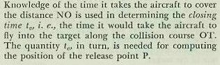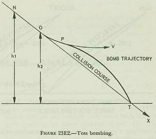 | 23E4. Skip bombing In skip or masthead bombing the plane usually attacks at less than 500 feet and the bomb is dropped so close to the target that computation is simple and accuracy high. If the target is a ship, the bomb is released to hit near the waterline just before the plane pulls up to pass over the target. Delay fuzes are employed to give the aircraft time to clear the target. Surprise is highly desirable because the plane is exceedingly vulnerable to AA fire. 23E5. Toss bombing Toss bombing is a technique wherein the pilot dives his plane directly at the target for a short time and then pulls out. The bomb is released automatically during pull-out, the pull-out maneuver giving the bomb additional forward velocity so that it is tossed above the original LOS and its trajectory intersects the original LOS at the target. Bombs can be released at higher altitudes than with dive or glide bombing. It necessitates only a short bombing run, but the plane is within effective AA range and is vulnerable during pull-out. In toss bombing, the airplane is flown initially along a collision course, a straight line path containing the target. If the bomb were released enroute, gravity would cause it to fall short. To overcome this difficulty, the pilot pulls out of his straight-line dive and releases the bomb at a precalculated point along this pull-out curve. The essential geometric features of the problem are indicated in figure 23E2. The straight-line dive at the target T, here considered to be stationary, is begun at a point above N; pull-out takes place at 0 along the curve OP. If the point P is calculated properly and release of the bomb occurs when this point is reached, the bomb trajectory will intersect the target. In the theoretical development we assume the final velocity of the aircraft in the dive to be reached at the point N; and we assume that this final velocity, which we shall denote by V, remains constant along the timing run NO and the pull-up arc OP. |