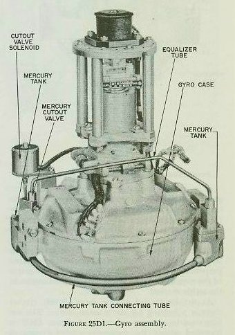 D. Mark 6 Stable Element 25D1. Introduction The Mark 6 stable element (fig. 25D5) is one of the three major units of the Mark 37 gun fire control system. It is located in the plotting room adjacent to the Mark 1A computer, as shown in figure 25C2. In general, the primary function of the Mark 6 stable element is equivalent to that of the stable vertical in the main-battery system; that is, it measures level angle (L) and crosslevel angle (Zd)- angles caused by the variation of the position of the deck of the ship with respect to the horizontal and hence required in the solution of the fire control problem. As will be explained in subsequent articles, the stable element accomplishes this function by using a gyroscope to establish the true vertical and its associated true horizontal plane. 25D2. Gyroscopic principles As explained in article 19G2, a gyroscope has two properties that make it useful in fire control. These properties are gyroscopic inertia, and precession. Because of its inertia, a spinning gyro tends to keep its axis pointed in a fixed direction in space. Because of precession, it tends to tilt its axis in a direction at right angles to that of any force applied to it. |