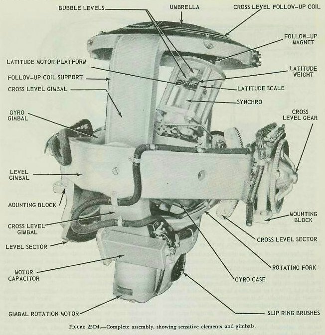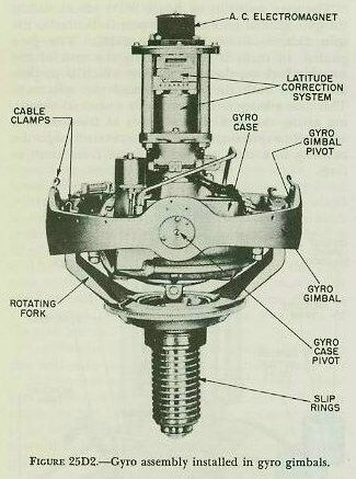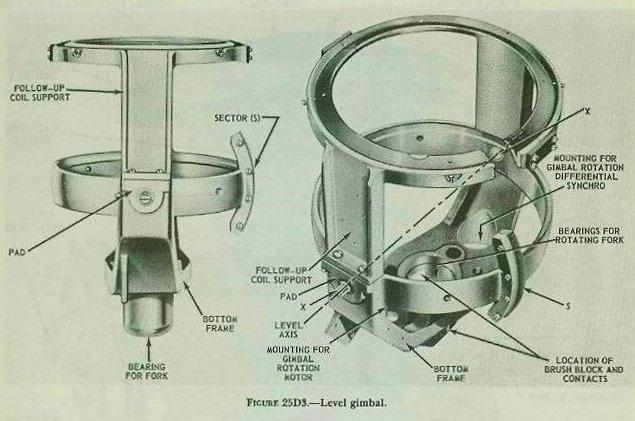 Figure 19G3, depicts the effect of the earth’s rotation on a free gyro. A gyro located at either pole, such as gyro A in the center illustration, will be unaffected by the earth’s rotation, inasmuch as a plane tangent to the earth at either of these points remains parallel to its original position in space. On the other hand, a gyro located at the equator will assume the successive positions with respect to the earth shown in the left-hand illustration. To an observer standing on the earth, the wheel will appear to turn completely over every 12 hours; that is, to turn backward (toward the west) with respect to the earth’s rotation at the rate of one revolution every 24 hours. At any point between the pole and the equator, as shown in the center and right-hand illustrations, the gyro wheel will appear to gyrate once every 24 hours about an axis parallel to the axis of the earth’s rotation and in a direction opposite to that of the earth’s rotation. This effect can be compensated for if the gyro can be made to precess slowly to the eastward at the same rate as the earth’s rotation. The gyro’s plane of rotation will then remain parallel to the horizontal plane. This is accomplished in the stable element by means of a latitude correction system which consists essentially of a latitude weight and a latitude motor. The latitude weight is so arranged as to cause a downward pressure at the north point of the gyro wheel, resulting in an easterly precession. The position of the latitude weight is adjustable, so that the weight can be set for the latitude in which the ship is operating. Usually it is considered sufficient to make a latitude setting once a day. To ensure that the latitude weight remains properly oriented in a northerly direction so as to cause easterly precession of the gyro, certain factors must be taken into consideration. The latitude weight, as shown in figure 25D2, is mounted at the upper end of the gyro assembly. The gyro assembly, however, does not remain stationary. It turns with the ship (in a horizontal sense) during a change of course (Co); it is rotated by director train (B’r), as will be explained in a subsequent article, to permit proper measurement of level angle (L) and cross-level angle (Zd); and, finally, it revolves at 18 rpm to permit proper operation of the mercury control system as previously pointed out. Obviously then, provision must be made to cancel out the effects of Co, B’r, and 18 rpm if the latitude weight is to re main in a northerly direction. This is done in the stable element by a synchro known as the latitude motor. The rotor of this motor supports the latitude weight, and the stator is attached to the gyro case. The electrical input to the motor positions the rotor with respect to the stator. Consequently this input must be the sum of ownship course (Go), training gear rotation (B’r), and gimbal rotation (18 rpm) if the latitude weight is to remain properly oriented. Two differential generators, which, in effect, are electrical differentials, are employed to make up this electrical input to the latitude motor. As illustrated schematically in figure 25D6, input Co goes to the director train differential (mounted in the base of the instrument) where B’r is added to it. The sum, Co+B’r, goes to the gimbal rotation differential (mounted on the level frame). There 18 rpm is continuously added to Co+B’r. The output to the latitude motor stator, Co+B’r+ 18 rpm, holds the latitude motor’s rotor stationary with the weight in a northerly direction-the 18 rpm effectively stopping the rotor on the LOS, B’r effectively bringing the rotor to the fore-and-aft axis of the ship, and Co orienting the rotor to North. 25D4. Mechanical construction The Mark 6 stable element, like the stable vertical used in the main-battery fire control system, consists essentially of a sensitive element and a measuring group. Sensitive element This is the heart of the instrument and consists of the gyro, gyro case, gyro gimbal, and a fork-shaped support known as the rotating fork. Figures 25D1 and 25D2 illustrate these parts in the stable vertical’s sensitive element. Corresponding parts in the stable element are essentially the same. Figure 25D1 shows the gyro proper. The wheel is carried on an axle supported by ball bearings at the upper and lower ends of the gyro case, the wheel and case forming the rotor and stator respectively of a high-frequency induction motor. A squirrel-cage winding, consisting of solid conducting bars, is in the gyro wheel, while wire stator windings are in the gyro case. A special motor-generator is provided to supply power at a frequency sufficient to drive the gyro at about 8,500 revolutions per minute. The gyro assembly of figure 25D1 pivots within the gyro gimbal on a case axis perpendicular to the spin axis, as shown in figure 25D2. The gyro gimbal, in turn, is supported by the arm of the rotating fork on the gimbal axis, which is perpendicular to both the case axis and the spin axis. This axis arrangement provides a universal mounting giving the gyro three degrees of freedom, and allows it to spin on a vertical axis, even though the rotating fork may vary its position from time to time. Measuring group. This consists of a level gimbal, a crosslevel gimbal, training gear, and as will be described more in detail in a subsequent article, an umbrella and its follow-up coils. Figures 25D3 and 25D4 illustrate the stable vertical’s measuring group. The measuring group of the stable element is not entirely the same. The important difference lies in the manner in which level angle (L) and crosslevel angle (Zd) are measured. In the stable element, the outer gimbal is the crosslevel gimbal, supported at its trunnion bearings by the training gear structure (main frame). The outer (crosslevel) gimbal, in turn, supports the inner or level gimbal so that the gimbal axes are mutually perpendicular. It can be seen from this gimbal 