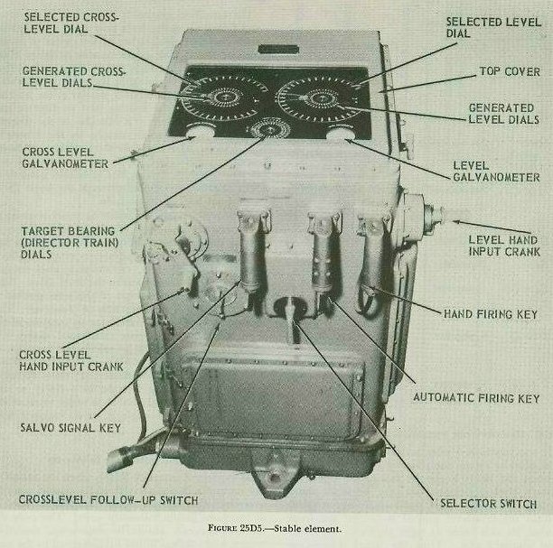25D6. Keys, dials, handcrank’s, switches The locations of most of the various keys, dials, handcranks and switches of the Mark 6 stable element can be seen in figure 25D5. Keys. There are three hand-operated keys on the front of the instrument. The right-hand key is a hand firing key that may be put into the firing circuit if desired. It is in no way connected with the internal arrangement of the stable element. The middle key is the automatic firing key. It operates in conjunction with automatic firing contacts in selected level or selected crosslevel fire. The third key is the salvo-signal key. It is used to sound buzzers in the mounts as a warning just before the firing circuit is closed. Dials. There are three sets of dials under the square window at the top of the instrument. The pair of concentric dials at the front and center indicate the fine and coarse values of director train B’r against a fixed index. The two remaining sets of dials each consist of a trio of concentric dials. The inner and intermediate dials respectively indicate fine and coarse generated values against a fixed index. The outer ring dial indicates the selected value against the same index when selected values are being used. The right-hand set of dials registers values of level, while the left-hand set indicates crosslevel. Two galvanometers are located on the top of the instrument, one for level and one for crosslevel. These galvanometers are used in conjunction with the handcranks described below during manual follow-up. Handcranks. There are two hand-input cranks installed on the stable element. They both have two separate and distinct uses. First, either one or the other may be used to put in a selected value, but both cannot be used simultaneously for this purpose. Secondly, the handcranks can be used in manual follow-up, a procedure which was mentioned in article 25D5 and which will be explained in detail in a subsequent article. Neither handcrank can simultaneously accomplish both uses. If, for example, the level hand-crank were constantly being rotated for manual follow-up in level (to keep the level follow-up coils centered over the follow-up magnet), it could not concurrently be used to set in a selected value of level. Both handcranks are either engaged or disengaged by magnetic clutches which are controlled by the selector and follow-up switches described below. Switches. Three switches are installed on the stable element for its control. They are: the selector switch, the crosslevel follow-up switch, and the level follow-up switch. The first two can be seen on the front of the instrument in figure 25D5. The third is located to the right of the level hand-input crank on the right side of the instrument. The selector switch is used in selecting the type of fire desired. It has three positions labeled LEVEL FIRE, CONTINUOUS FIRE, and CROSSLEVEL FIRE. When the selector switch is thrown to a selected type of fire (for instance, level or crosslevel), it causes the corresponding handcrank to become engaged. The two follow-up switches, which are identical in operation, control the method of follow-up used. Each has two labeled positions, AUTOMATIC and MANUAL. The switches have nothing to do with the type of fire used but, if a switch is on MANUAL, its corresponding handcrank, already being used for manual follow-up, cannot be used for selected fire. For example, if the level follow-up switch were on MANUAL, selected-level fire could not be used but crosslevel fire could be used; therefore, in this particular instance, the selector switch would have to be on either CONTINUOUS FIRE or CROSSLEVEL FIRE. |