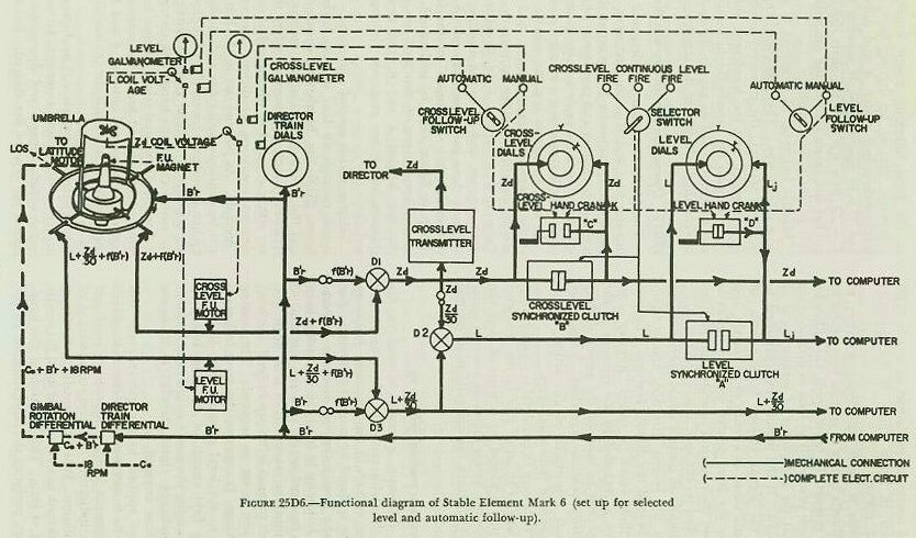 25D7. Inputs and outputs The inputs and outputs of the Mark 6 stable element are summarized below, together with their more important uses. Most of them have been discussed previously, either in the preceding articles or in the study of the Mark lA computer and the Mark 37 director. It should be noted that all outputs to and inputs from the computer, listed above, are transmitted mechanically by shafting. On the other hand, Co and the value of Zd sent to the director are both electrically transmitted. Inputs Quantity......................Received from............Used 1. B’r..........................Computer................... To assist in making up L and Zd; to orient gimbals to LOS; to orient latitude weight to North. 2. Co...........................Gyro compass............ To orient latitude weight to North. 3. Own ships latitude...Set manually.............. To counteract for earth’s rotation effect on gyro. 4. Lj or Zdj..................Set manually.............. In selected fire. Outputs 1. Zd...........................Director..................... To stabilize optics and radar antennas. 2. Zd or Zdj.................Computer................... To compute Br from B’r; to compute trunnion-tilt correction. 3. L or Lj.....................Computer................... To compute E from Eb, Br from B’r and trunnion-tilt correction. 4. L + Zd/30................Computer................... To make up elevation correction. |