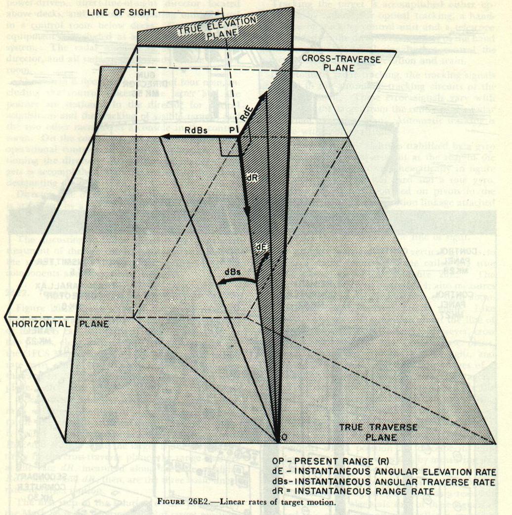 The solution, however, requires the use of linear rates of target motion, in a plane perpendicular to the line of sight at target’s position. This plane is called the cross-traverse plane, and contains RdE and RdBs. Since the target is not moving entirely in the cross-traverse plane, the range changes at the rate dR, measured along the line of sight. RdE, RdBs, and dR, then, are the three basic linear rates of target motion.