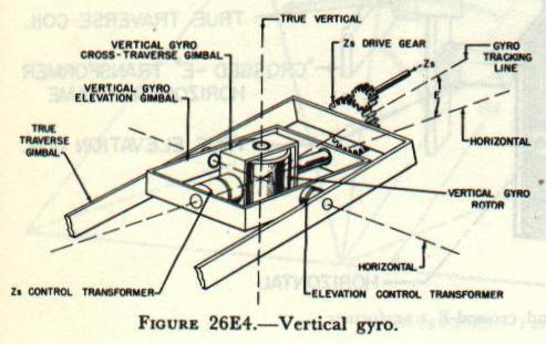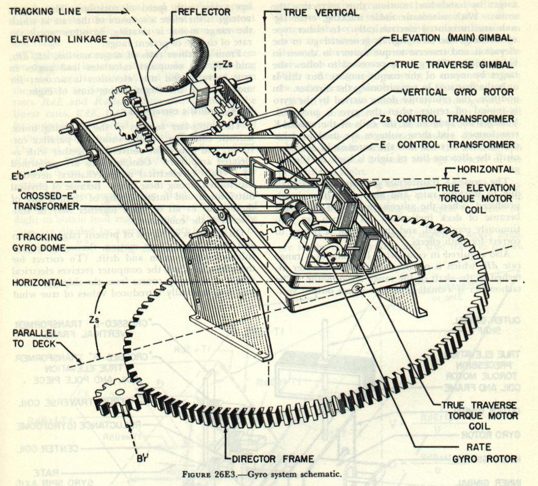 figure 26E4, also measures E, true elevation of the director line of sight above the horizontal, and Zs, cross-traverse angle. Like cross level, cross traverse is motion about the line of sight due to movement of the deck. However, cross traverse is measured in the cross-traverse plane, which is perpendicular to the line of sight, and therefore differs from cross level. The values of E and Zs are picked off by elevation and cross-traverse control transformers and are transmitted to the computer, where they are applied in calculating ballistic corrections and gun orders. Zs also goes to the cross-traverse drive gear of the rate gyro.