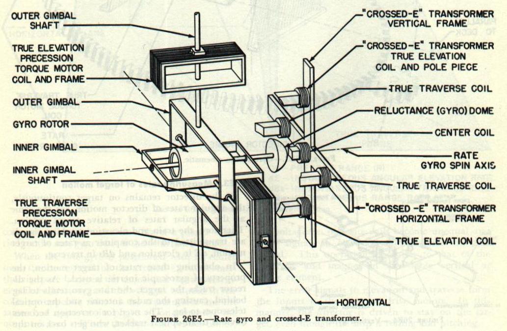 figure 26E5, controls the drive motors which position the director in train and elevation. The gyro does this by measuring the angular rates of target motion in the form of electrical tracking signals and combining these signals with the stabilizing signals generated as a result o deck motion. The algebraic sum of these signals is obtained in a set of pick-off coils called a crossed-E transformer and shown in