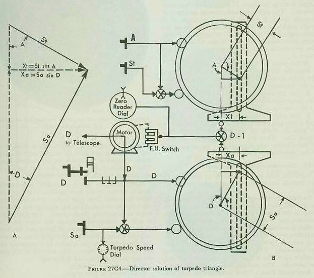 The case houses the units which solve the torpedo fire control problem, transmit torpedo course (Car) and gyro angle (G) to the tube mounts, and receive own ship’s course (Co) from the gyro compass. The knobs for hand inputs and all dials are attached to the case. All inputs are manual except own ship’s course (Co), and if the automatic transmission fails, the Co knob can be used to introduce this value manually. The telescope unit is normally positioned by a servo follow-up motor within the case. This may also be done manually with the sight-angle crank, on the right side of the case. The Telescope Mark 50 consists of a tiltable mirror and fixed-prism telescope mounted on a pivot. The tiltable mirror makes it possible to hold the line of sight on the target as the ship rolls and pitches. The pivot is supported on a ball-bearing assembly attached to the top of the case. It is geared to the computing mechanism within the case and is automatically turned with respect to the case through the computed sight angle. 27C4. The director solution In solving the torpedo problem by a director the initial set-up is made by (1) making manual settings of St, Sa, Gt or A, (and of Co if not received electrically) (2) receiving own ship’s course Co electrically, and (3) keeping the telescope line of sight on the target. The introduction of these settings will set up on the main dial group of the director a picture such as shown in figure 27C3. In each dial group the outer ring is a compass ring, the middle ring represents the ship (own ship in group A, target ship in group B), and the central ring represents the torpedo track in relation to own ship and target. The director solves for sight angle by the principle of equal deflections, in which torpedo deflection (Xa) must equal target deflection (Xt). Then, since Xt=St sin A and Xa=Sa sin D, sin D equals St sin A/Sa Figure 27C4 (A) shows the elements of the firing-ship-target set-up and figure 27C4 (B) shows how two component solvers are used to solve for D. In this elementary solution, gyro angle, latitude correction, intercept and tube offsets, and spread angles are not considered. The target solver, from inputs of target course, target speed, own-ship course, and relative target bearing, produces Xt (target deflection component). The sight-angle solver, with an input of torpedo speed, is rotated through an angle of D (sight angle) by the sight-angle servo motor or the sight-angle hand crank, until its output, Xa (torpedo deflection) equals Xt. When Xt equals Xa, the zero-reader dials in the torpedo director are matched. At this point the following relationships exist: Since the telescope LOS is directed at the target, the angle measured clockwise from the ship’s bow to the telescope axis is relative target bearing Br. 2. The telescope unit has been offset from the line perpendicular to the face of the director case by the amount of basic sight angle D. 3. The angle between the bow of the firing ship and a line perpendicular to the face of the case is Br plus D, which (if corrections be disregarded) equals Car. Thus the perpendicular to the face of the director case is parallel to the mean track of the torpedoes. |