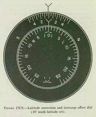 27C5. Corrections to basic sight angle Corrected sight angle is obtained by modifying D for latitude correction, Gm, and intercept offset, Osi. Latitude correction, set manually, compensates for the inherent tendency of the torpedo gyro to creep to the right in north and to the left in south latitudes, due to the rotation of the earth. (No correction is necessary unless the latitude in which the torpedoes are to be fired differs from that at which they were last proved or at which their gyros were last balanced.) The magnitude of the correction depends upon the length of the torpedo run and the latitude. The amount of correction necessary is determined from a “click table” which indicates the number of clicks of the latitude-correction knob required to correct for the latitude in question. Each click moves the dial 10 minutes. Figure 27C5 shows the latitude correction and intercept offset dial. The outer ring is used for latitude settings and the inner dial for setting intercept offset. In the figure, 10’ south latitude correction has been set by rotating the outer ring, causing the S portion to lie opposite the fixed index. The intercept offset dial does not move while making this setting and must be rotated until the zero mark is opposite the index on the latitude ring. This rotation of the intercept offset dial introduces the latitude correction into the director. |