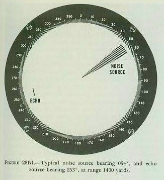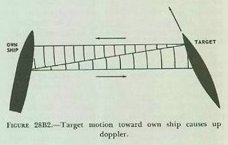 On the CRT-scope, a dotted line indicates the true direction of the stern of the ship (i. e., ship’s head plus 180°). Thus the operator can, at any time, determine the relative bearing of the target as well as the direction of the ship’s baffles. The dotted line extends in the direction of the ship’s stern, rather than its bow, so as not to obscure the target pip during an attack. 2. Audio presentation. The audio scan covers eleven degrees of bearing. It is controlled by the bearing knob, which is discussed in a subsequent paragraph. The direction of the audio scan (1. e., the direction in which the QHBa equipment is trained to receive an echo) is indicated on the CRT scope of the QHBa indicator control by a bright line called a cursor. The cursor flashes on the scope at the instant the outgoing sound pulse is transmitted. Its length is adjustable. When the cursor bisects the target pip, and its length is so adjusted that its outer end just touches the pip, the cursor bearing will be the true sonar bearing Bq, and the cursor length will furnish an indication of sonar range Rq. The returning echo, after conversion to an electrical signal and amplification, is changed to an audible frequency and sent to a loudspeaker near the QHBa indicator control, where it is heard as a sharp “ping.” This ping is of value in target identification, and in the determination of doppler. Up doppler results from an increase in frequency, or pitch, of the returning sound waves, caused by a target’s true motion toward own ship. Down doppler results from a decrease in frequency of the returning sound waves, caused by a target’s true motion away from own ship. A target that causes up doppler is said to have bow aspect, while a target that causes down doppler has a stern aspect. In other words, target motion or aspect (but not range rate) can be deduced from the doppler effect. To determine doppler, the sonarman must compare the pitch of two echoes; the first echo, consisting of reverberations from the water immediately surrounding the transducer, is compared with the echo that returns from the submarine. The relative frequency of the target echo depends on whether the submarine compresses the sound wave (up doppler, indicating bow aspect), expands it (down doppler, indicating stern aspect), or sends it back unchanged (no doppler, indicating beam aspect). See figure 28B2. Own ship’s motion affects the pitch of the initial echo; but since it has the same effect on the pitch of the returning target echo, the doppler detected by comparison of the two is not changed by own ship’s motion, and it is this comparison that indicates the target aspect. To facilitate the detection of doppler, doppler nullifier circuits are installed in the QHBa. These circuits remove the effect of own ship’s motion on the pitch of the echoes heard by the sonarman. In this way the variations caused by changes in own-ship speed and course are eliminated, making doppler detection easier. |