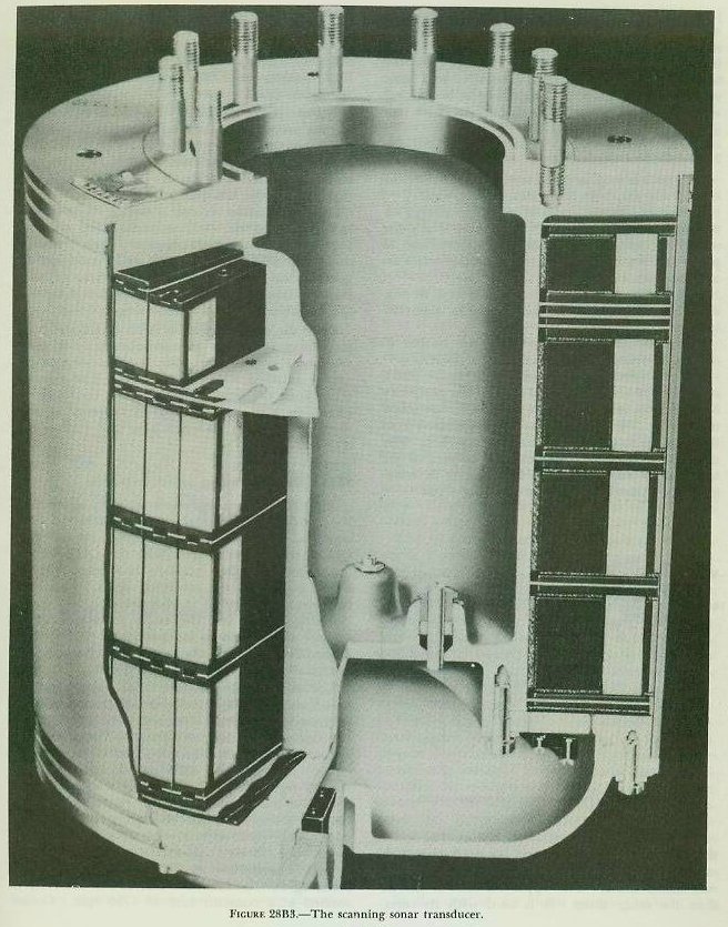 Each stave consists of four elements. The lower three are of the same size, and are used with their counterparts in the other staves to form the nor-mat sound beam. The upper element is shorter than the other three. It is used with its corresponding elements in the other staves to form a beam which is broadened vertically and which, consequently, is desirable for the maintenance of close contact. The upper elements are used when the MCC (maintenance of close contact) switch is on. See figure 28B4. All the staves are made of a nickel alloy which has the property of vibrating whenever an alternating magnetic flux penetrates it. This property is known as magnetostriction. Each element of a stave is surrounded by a coil. During transmission, this coil receives an alternating current from the QHBa transmitter-receiver. When this current passes through the coil, an alternating magnetic field is produced which penetrates the element of the stave, causing it to vibrate and hence produce a sound wave. The magnetic field is so adjusted that the frequency of this vibration is the same as the frequency of the applied current. Once the sound pulse has been transmitted, the transducer staves act as microphones; and, upon receipt of a returning echo, the sequence of the events outlined above is reversed. The acoustic echo causes the staves to vibrate; and the vibrating staves, in turn, cause electrical currents to flow through the coils and hence to the transmitter-receiver. 28B5. QHBa scanning-switch assembly The QHBa scanning-switch assembly determines the bearings of returning echoes and hence of sonar contacts. It is installed electrically between the QHBa transmitter-receiver and the QHBa transducer, and therefore controls both the outgoing sound pulse and the returning echo. There are two scanning switches in this assembly, the video scanning switch and the audio scanning switch, each of which operates independently of the other. Essentially both are the same, mechanically and electrically. |