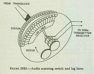 1. Video scanning switch. The video scanning switch consists basically of two metalized glass discs separated by a narrow air space. One disc is called the stator; the other, the rotor. The rotor and stator have 48 aluminum capacitor segments each, equally spaced about their peripheries. Each of the 48 segments of the stator is connected electrically to a corresponding stave of the transducer. On the rotor, 30 of the 48 segments are shorted out so that, in effect, there are only 18 active segments (i. e., 18 segments that can receive electrical signals from the stator). The stator of the video scanning switch is fixed. The rotor, however, is rotated at a constant rate of 1750 rpm. Consequently, target echo signals received from the 48 staves of the transducer by the 48 segments of the stator can be scanned consecutively, 18 at a time, by the rapidly rotating 18 active segments of the rotor. The scanning provides video indication of the sonar bearings of all targets within 360° arc in azimuth (as will be explained below). 2. Audio scanning switch. This switch has essentially the same construction as the video scanning switch. However, its rotor, instead of being rotated continuously, is positioned in any desired direction .by the bearing knob of the QHBa indicator control. Hence the 18 active segments of this rotor will scan echo signals from only 18 stator segments (and hence 18 transducer staves) when positioned in any one desired direction. This scanning provides an audio indication of the sonar bearing of any one particular target. Figure 28B5 is a diagram of the audio scanning switch and the lag lines (which are explained below). 3. Bearing determination. If the QHBa scanning sonar equipment were to employ a plane transducer (i. e., one with a flat transmitting/receiving surface) instead of its cylindrical one, this plane transducer would be able to transmit a sound pulse in (and hence receive a returning echo from) only one particular direction at any one time. The sonar bearing of the target echo in such a case, consequently, could readily be ascertained by noting the direction in which the transducer was trained. However, echo-ranging with such a transducer would be a slow process, hardly adequate for effective 360° search. Therefore the QHBa employs the cylindrical type of transducer described earlier in this article. This cylindrical type not only can transmit a sound pulse in every direction in azimuth simultaneously, but it can receive returning target echoes from any direction at any time between transmissions. This naturally makes possible the early detection of all targets within sonar range. Since the receiving transducer surface is cylindrical, and hence nondirectional, the direction from which a target echo is received cannot be measured by some simple method such as training the transducer itself. The video and audio scanning switches are used for this purpose. Whenever a sound wave strikes a submerged submarine, part of its energy is reflected as an echo. This echo, upon leaving the target, fans out in several directions at once. By the time it arrives at the transducer it has, for all practical purposes, a plane front (i. e., a straight leading edge). The transducer stave nearest the target in bearing consequently receives an acoustic echo signal sooner than its adjacent staves. The video and audio scanning switch stator segments connected to this stave receive, as a result, electrical echo signals (suitably amplified by the preamplifiers of the scanning-switch assembly) sooner than their respective adjacent segments. Thus the reception of all electrical echo signals by the stators is comparable to the reception of all acoustic echo signals by the transducer. Consequently, for purposes of target bearing determination, only the stators need be considered. It was pointed out previously that the sonar RECEIVER bearings of a target could not be measured readily by a cylindrical transducer because of its curved surface and hence nondirectional characteristics. The 18 active segments of the rotor are made to act as a plane transducer by the use of lag lines. The direction of the 18 active segments when the signal is received gives the bearing of the target. A similar set of lag lines can be found on the audio scanning-switch rotor. As the 18 active rotor segments of either the video or the audio scanning switch are positioned opposite any 18 segments of the appropriate stator, electrical charges on the stator segments jump the narrow air space to the active rotor segments and enter the lag lines. The lag lines effectively “slow down” these electrical signals proportionally so that all the signals, despite their times of receipt, leave the lag lines at the same instant. In other words, the lag lines combine the voltages of these signals in the proper manner (by shifting them into phase with one another and by appropriate attenuation) to produce a total voltage which will be a maximum when the angular position of the rotor (i. e., the midpoint of the arc formed by the 18 active segments) corresponds to the actual direction of the target. In the case of the audio scanning switch, this total voltage is sent to the receiver audio channel in the QHBa transmitter-receiver, where it is used to produce the audible “ping.” In the case of the video scanning switch, the total voltage is delivered to the receiver video channel in the QHBa transmitter-receiver, where it is amplified and rectified for use in the QHBa indicator control as a brightening signal. Since the circular sweep of the CRT scope in the QHBa indicator control is synchronized with and hence rotates at the same speed (1750 rpm) as the video scanning switch rotor, this brightening will occur at the correct bearing on the CRT-scope. 28B6. QHBa data converter This unit has two functions. For one thing, it orients the visual presentation on the CRT-scope of the QHBa indicator control so that the top of the scope r