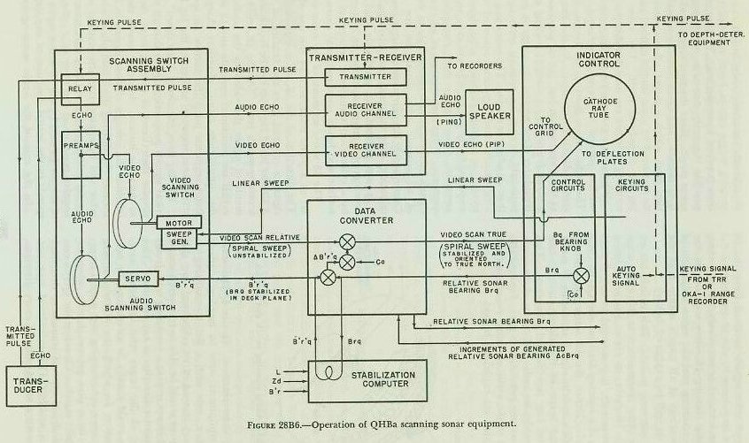 B. QHBa Scanning Sonar Equipment 28B1. QHBa scanning sonar equipment-general At the present time, sonar equipment model QHBa is in use on some of the operational destroyers, and at most training activities. Although this will be the only equipment described in this text, it is now being replaced in the Fleet by model SQS4 and related equipment. This model differs from the QHBa in details of construction and circuitry, but not in general principles. Model QHBa combines echo-ranging and listening equipment in one unit. On a cathode-ray tube (CRT)-scope, similar to a radar PPI-scope, it provides a continuous visual display of echo reception from all directions in azimuth, and an audible response from any desired single direction. The QHBa equipment consists of the following five major units: 1. Indicator control. 2. Transmitter-receiver. 3. Transducer. 4. Scanning switch assembly. 5. Data converter. These units, their functions, and their operation will be discussed in detail in the articles following. 28B2. QHBa indicator control The QHBa indicator control, as its name implies, controls the operation of the QHBa equipment and provides for the video and audio presentation of target echoes. 1. Video presentation. At the instant that a pulse of sound energy is projected into the water in all directions, a luminous spot on the CRT scope (i. e., the trace of the electron beam) begins to spiral outward from the center. This spiraling motion is in reality a combination of two motions. One, a straight-line movement of the spot toward the periphery of the scope, is called the linear sweep. The other, a circular movement of the spot about the center of the scope, is known as the circular sweep. The linear sweep occurs at a relatively slow rate of speed. The circular sweep, on the other hand, occurs at a relatively high angular rate (1750 rpm). The result is that the QHBa operator observes the motion of the electron beam trace or spot not as a spiral but rather as an expanding circle of constantly increasing radius. When the outgoing pulse of sound energy strikes a submerged object such as a submarine, part of its energy is reflected as a target echo. This echo, after being received, changed into an electrical signal, amplified, and rectified, is applied to the control grid of the cathode-ray tube and causes a bright spot or pip on the CRT-scope. Because of the persistence of the scope, this pip, along with other target pips, remains on the scope long enough to be reinforced by another returning echo. The result is a map-like presentation which is invaluable in target detection. The range and bearing of a sonar contact can be determined easily from the position of the pip displayed on the CRT-scope. The distance from the center of the CRT to the edge of the screen represents a definite range. (For example, during search this distance represents 3750 yards.) The beam trace moves outward from the center at a uniform speed, and takes exactly twice as long to reach the edge of the screen as the sound pulse takes to travel the corresponding distance. When the sweep reaches the position to represent any given range, the sound pulse will have had time to reach a target at that range and return. Thus the distance of a target pip from the center of the screen provides an accurate measure of target range. And, since the scope presentation is so oriented that true North is at the top of the screen with own ship at the center, the angular displacement of the pip from the top of the screen indicates the true sonar bearing Bq of the target. See figure 28B1. |