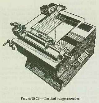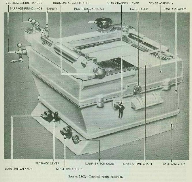 C. Controlling the Attack 28C1. General Sonar can search out the target, but course-to steer and firing time must be determined by other instruments. Two such instruments are the tactical range recorder (TRR) and the antisubmarine attack plotter (AP). 28C2. Tactical range recorder (TRR) The tactical range recorder (TRR) produces a time/range plot of target echoes on chemically sensitized paper by means of a moving stylus. See figure 28C1. The stylus moves across a chart at a speed proportional to half the speed of sound in water and the chart paper moves at a constant speed in a direction perpendicular to the stylus motion. The tactical range recorder accomplishes the following functions: 1. It provides a means for measuring sonar range Rq and sonar range rate. 2. It provides a means of determining firing time (i. e., the time when Tud = 0) for either the stern-dropped (depth-charge) attack or the throwing-weapons (hedgehog) attack. 3. It provides a visible plot of the audio reception to help identify target echoes. 4. It may be used to control the keying circuit of the QHBa scanning sonar equipment. The TRR has two range scales. The 0-3750 range scale is etched on a black metal plate on the top of the recorder, above the window over the chart. The 0-1500 yard scale is inside the window just above the chart; it is etched on clear lucite, and illuminated by an inside light. Sonar range Rq is read by noting the appropriate scale reading of the last stylus mark made on the paper. Therefore, when on long scale, the entire width of the chart paper represents 0-3750 yards, while on short scale it represents 0-1500 yards. (Both the QHBa indicator control and the OKA-l range recorder have the same scale arrangement.) |