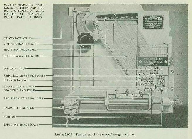 As will be seen in figure 28C3, there are several scales used to set in the various values concerned with determining the time to fire a hedgehog barrage or depth-charge pattern. The majority of these scales are set for certain physical characteristics of the ship and are not changed as the attack progresses. These are- 1. Bow firing-lag scale (inscribed FIRING LAG SEC.). On this scale is set the total time interval between the moment the A/S officer orders “Fire” and the instant the hedgehogs hit the water-dead time (Tg) plus time of flight (Tf). The dead-time factor in this setting is determined by a time study on each ship; the time-of-flight factor, from appropriate range tables. 2. Firing-lag difference scale (upper right scale inscribed 0, 6, 12). The purpose of this scale is to eliminate the necessity of changing the setting on the bow firing-lag scale every time the ship changes from a H/H to a D/C attack. The proper setting on this scale removes the error of an “earlier firing time” that would exist in a D/C attack after the bow firing-lag scale is set equal to Tf + Tg for H/H. In order to maintain the correct time relationship between the two types of attack, it is necessary to consider the different “dead times” for H/H and D/C. If Tf + Tg (for H/H) is set on the bow firing-lag scale, it is apparent that the same value should be set on the firing-lag difference scale in order to offset the Tf + Tg which would be erroneous for D/C. At this point the setting on both scales is the equivalent of Tf + Tg for H/H equals Tf+ Tg=0 for D/C. Since more dead time for D/C necessitates earlier firing, the stern-data scale is moved UP the firing-lag difference scale a distance equal to the dead time (for D/C) from the original position (Tf + Tg for H/H). The SETTING for the firing-lag difference scale is therefore calculated from the formula Tf + Tg (for H/H) - Tg (for D/C). Example: For H/H, Tf = 8 sec.; Tg = 3 sec. For D/C, Tg = 5 sec. Setting on bow firing-lag scale 8 + 3 - 11 sec. SETTING ON FIRING-LAG DIFFERENCE SCALE 8 + 3 - 5 = 6 sec. 3. Projector-to-stern scale (inscribed PROJ. TO STERN). On this scale is set the distance in feet from the sonar transducer to the depth-charge racks on the stern (i. e., the parallax base line P1). It is obtained from ship’s plans and is constant for each ship. 4. Backing-plate scale (located beneath RE scale and inscribed FEET). The distance in feet from the sonar transducer to the depth-charge racks on the stern is set on this scale to remove the effect of the projector-to-stern scale setting when firing throwing weapons. 5. Effective-range scale (inscribed RE). On this scale is set the range of the hedgehog missiles Re as determined by the conditions existing at the time. 6. Zero-zero scale (to the left of RE scale and inscribed 0, 6, 12). This scale is used for alignment purposes. In addition to the more or less permanent scales above, there are also two scales whose settings may have to be changed as an attack progresses. They are- 7. Stern-data scale (inscribed STERN). On this are set own ship’s speed of attack (So) and the sinking time (Td) (labeled D C. SETTING SECONDS) for depth charges. The ship’s speed is obtained from the pitometer log, and the sinking time depends on the target depth. The sinking rate for all types of depth charges has been so tabulated that the sinking time to any depth may be determined readily. Depth charges are set to explode at a pattern in depth as well as in range and deflection, in order to enclose a volume of water which will include the submarine. The measured or assumed depth which is the mean of the pattern is used in making this setting. 8. Bow-data scale (inscribed Bow). On this are set own ship’s speed of attack (So) and the sinking time (Td) for hedgehogs. As in a depth-charge attack, the ship’s speed is obtained from the pitometer log and the sinking time is calculated from the known sinking rate of the hedgehogs to the measured or assumed depth. The settings on the stern- and bow-data scale are made by means of the data-scale indicator. This indicator is a lucite arm which is attached to the horizontal slide bar; its index, as illustrated in figure 28C3 is a “dot.” This index or “dot” is positioned over the intersection of the proper data lines (So and Td) on either the stern-data scale (for a DJC attack) or bow-data scale (for a fixed H/H attack) by means of the horizontal slide knob and vertical slide handle. As the data-scale indicator, projector-to-stern scale, bow firing-lag scale, and plotter bar are all mounted on the same frame and hence all move together whenever the horizontal slide knob or the vertical slide handle is turned, it can be seen that movement of any of the above scales will move the “dot” away from its proper position (intersection of So and Td) on the bow-data or stern-data scale or move the intersection of So and Td out from under the “dot.” The situation is then corrected by movement of the horizontal slide knob or the vertical slide handle which moves the “dot” back over the original intersection; consequently, the firing line on the plotter bar is moved closer to or farther away from the traces on the chart paper. The manner in which a setting is made on any of the more-or-less permanent scales can be seen in figure 28C3. Briefly, a value is set on the- 1. Bow firing-lag scale, by moving the projector-to-stern scale vertically. 2. Firing-lag difference scale, by moving the stern-data scale vertically. 3. Projector-to-stern scale, by moving it horizontally. 4. Backing-plate scale by moving the effective-range scale (RE) horizontally. 5. Effective-range scale by moving the bow-data scale horizontally. As previously mentioned, these settings on the more-or-less permanent scales (listed in 1-5 above) all serve to position either the stern- and bow-data scales or the data-scale indicator index with respect to the origin of the chart paper. C