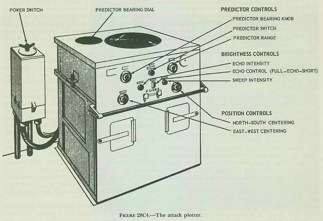 The Attack Plotter, shown in figure 28C4, is an electronic instrument which displays on the face of a cathode-ray tube a geographical picture of own-ship and target motion. The own-ship indication, as illustrated in figure 28C5, is a single bright dot that moves across the scope according to the true course and speed of own ship, as received automatically from the gyro compass and pitometer log. There are N-S and E-W controls on the front of the instrument for making initial settings of own ship’s position. These are similar to the controls used to position the “bug” on a Dead Reckoning Tracer (DRT). In effect, the Attack Plotter is an electronic DRT which shows own-ship motion automatically, as well as target position relative to own ship. The target position, which is indicated on the scope as a bright spot, is controlled by the audio section of the QHBa Scanning Sonar Equipment. As the sound beam is projected through the water a faint line is visible on the scope, originating at own ship and proceeding in the direction the audio section is trained. If the beam strikes a target and an echo is returned, the trace is momentarily brightened so as to display on the scope a bright spot representing the target. The picture of relative motion thus presented assists the operator in determining the proper course to steer to reach the firing position. Another feature of the Attack Plotter which enables the operator to better estimate the course to be steered (cCo) and the time at which to fire ahead-thrown weapons (Tud = 0) is the “predictor line.” |