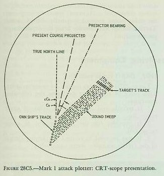 This is a bright line which momentarily flashes on the face of the scope immediately after own ship’s spot, and just before the sound sweep starts. The direction and length of this line can be adjusted by the operator. The true bearing of the predictor line is controlled by a Predictor Bearing Knob on the front of the Attack Plotter, and read on a dial on the top. The length of the predictor line, or Predictor Range, is determined by a three-position knob known as the Predictor Switch. When this switch is in the OFF position, the predictor line does not appear on the scope; when it is set to the “1000” position, the length of the predictor line is fixed at 1,000 yards (4 inches on the scope); and when it is placed in the “RANGE” position, the length of the predictor line is governed by the three Predictor Range Controls which, by appropriate combinations, permit the setting of any range from zero to 580 yards. Normally the Predictor Switch is kept on RANGE. However, the 1,000-yard position is useful on occasions when own ship and target are separated by more than the 2500-yard (10-inch) width of the scope. In such cases, own ship can be placed off the scope and still be conned toward the target by means of the long predictor line. The OFF position also is useful at times, since it permits the presentation of targets closer than 150 yards. Such targets can not normally be seen when the predictor line is shown on the scope. In order to conduct an attack using ahead-thrown weapons, the following procedure should be used: 1. By means of the N-S and E-W controls on the front of the instrument, orient own ship and target so that the target will be headed for the center of the scope. This is done so that a continuous plot of own ship and target will be possible without the necessity of “repositioning” during the attack and thus interrupting the continuity of the plot. 2. By means of the Predictor Range controls, adjust the length of the predictor line to the effective range of hedgehog missiles when controlled by the Attack Plotter. (The computation of this effective range will be discussed in more detail later.) As previously stated, the true bearing of the predictor line may be controlled by the operator. Using the Predictor Bearing knob, estimate a course which when steered by own ship will result in a situation in which the end of the predictor line will pass through the predicted position of the target. It will be recalled that from the instant the word to fire is given, there will be an elapsed dead time Tg until the weapon is fired, a time of flight Tf until the pattern lands, and a sinking time interval Td until the H/H’s sink. If this total time is, for example, 20 seconds, the target will move during this 20-second period and the H/H’s must be at the predicted position at the end of this time. The true bearing of the predictor line is automatically transmitted to an indicator on the bridge in front of the helmsman as the course to steer, or own-ship course order cCo. The target’s course can be estimated on the scope from the target’s apparent motion, and target speed can be approximated by comparison with own ship’s speed, bearing in mind that the scale of the scope is about 250 yards per inch. Continual adjustments of own-ship course order can be made as the range closes, so as to compensate for target maneuvers. The time at which firing should occur (Tud = 0) is reached at the instant the end of the predictor line leads by a proper amount the “pip” indicating the target position, or, more specifically, when it leads the target by an amount (expressed in inches) equal to target speed S times the quantity (Tg + Tf + Td). From the above it may be seen that the fire control problem is quite accurately solved from the range standpoint, but leaves much to be desired as regards determining the proper approach course. The accuracy of the proper approach course is largely dependent on the operator’s understanding of the relative motion of own ship and target. In conducting a depth charge attack, the same general principles are used to arrive at the firing position. In this case own ship must cross over the predicted target position before the charges are dropped. In figuring the predicted position, only dead time and sinking time are used; time of flight is not considered. However, when arriving near the firing point, control is usually shifted to the Tactical Range Recorder for firing the depth charge pattern. |
