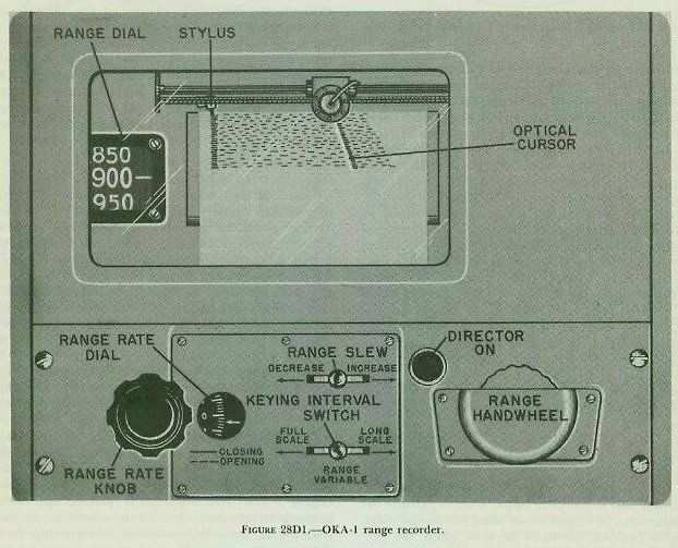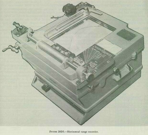 | If the OKA-l range computer were to compute horizontal sonar range cRhq from inputs of target depression Eq and a straight-line value of sonar range Rq (= ABE in the illustration), the target�s position would be established erroneously at point E. However, by generating its own value of target depression cEtq from Hq and a straight-line value of Rq (= AD in fig. 28D2), the range computer effectively establishes the target�s position as point D, which is at the correct depth and at a horizontal sonar range cRhq only slightly greater than the true horizontal sonar range Rhq. This approximation of cRhq is possible since the range error (i, e., the difference between cRhq and Rhq) progressively diminishes as the target closes and the amount of sound-beam refraction decreases. The OKA-l range computer accomplishes its second function, the computation of stylus speed for the depth recorder, in conjunction with the depth-determining equipment. The manner in which it does this will be discussed in section E. 28D4. OKA-1 horizontal range recorder The value of horizontal sonar range cR�hq generated by the OKA-l range computer is transmitted not only to a range and depth indicator but also to the OKA-1 horizontal range recorder (fig. 28D3) whose functions are- 1. To record the value of generated horizontal sonar range cRhq. 2. To provide for the measurement of horizontal sonar range rate. 3. To provide a means of determining firing time (i. e., when Tud=0) for either the stern-dropped (depth-charge) attack or the throwing-weapons (hedgehog) attack. In construction and operation, the OKA-1 horizontal range recorder is basically the same as the tactical range recorder, differing from the tactical range recorder in really only two major respects: 1. It employs a nonreciprocating rather than a reciprocating stylus. 2. Its operation is based on an input of generated horizontal sonar range cRhq rather than an input of the audio response from the QHBa equipment. |