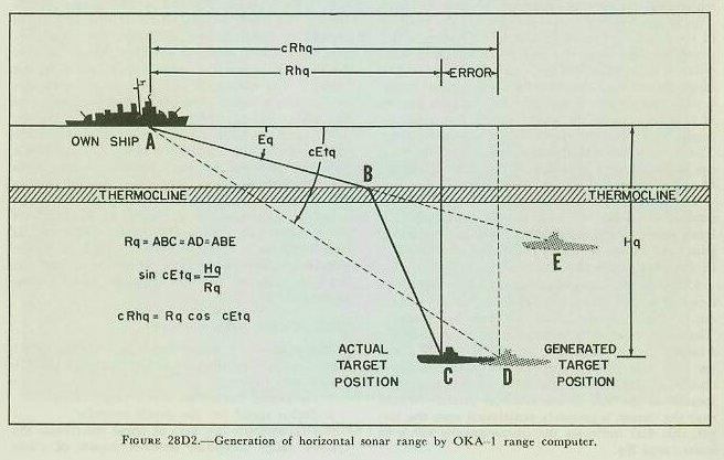 | The stylus starts its recording motion at the instant the transmitted pulse leaves the transducer. The audio signal received by the QHBa equipment is applied to the stylus, causing a passage of current through the paper when an echo is received and resulting in a visible mark. Therefore, since the stylus started its motion at the instant the pulse was transmitted and moves at a rate proportional to half the speed of sound, the distance from the starting point to the mark is a measure of the sonar range to the target. Determination of the sonar range to the target is accomplished by an optical cursor (light beam) which projects a cursor image on the recorder chart. This image is moved across the chart to the position of the last target mark by a synchro system which provides sonar range Rq to the OKA-l range computer and, in addition, indicates the value of this range on a dial on the recorder. The optical cursor is rotatable, so that it may be lined up with a series of range marks as the paper moves down the recorder at a constant speed which represents time. The slope of the optical cursor, when properly lined up, is therefore a measure of the rate of change of sonar range. The controls for operating the OKA-l range recorder are located on both the top panel and the front panel of the instrument. Those on the top panel are shown in figure 28D1 and are described in the paragraphs that follow. 1. Range slew, range handwheel, range dial. The range slew and range handwheel move the optical cursor (light beam) across the scale horizontally. The slew is used to position the cursor initially on a target; the handwheel, to provide the attack director with rate control corrections. Any horizontal motion of the cursor is recorded on the range dial located at the left of the recorder chart. Whenever the cursor is properly positioned over the target, this dial indicates the instantaneous value of sonar range Rq. 2. Range-rate knob and dial. These are shown at the lower left corner of figure 28Dl. The range-rate knob controls the slope of the optical cursor as well as the operation of the cursor-positioning synchro system mentioned above. When the knob is turned so that the cursor assumes a vertical position, the reading on the range-rate dial will be zero and the synchro system will not move the cursor. This is the normal condition when slewing to a new target. However, once a target is acquired and the optical cursor is aligned with a series of range marks which collectively have a definite slope, the range-rate dial will indicate a value of range rate corresponding to that slope. Moreover, the value of range rate will cause the synchro system to position the cursor continuously over the range marks. As long as the actual range rate of the target does not change, the target will be tracked automatically and correct values of Rq will be transmitted to the OKA-l range computer. 3. Keying-interval switch. The switch controls the keying interval of the QHBa, and thus the stylus speed and chart scale of the range recorder. This switch has three positions: LONG SCALE, FULL SCALE, and RANGE VARIABLE. In the LONG SCALE position, the chart width represents 3,750 yards and the stylus traverses the full width thereof before hitting the fixed flyback, which returns the stylus rapidly to the left. In the FULL SCALE position, the chart width represents either 3,750 yards or 1,500 yards depending upon the location of the cursor. The change of scales occurs automatically as the cursor passes about the 1,450 yard point of the scale. Thus when a target closes from say 2,500 yards to 1,450 yards, the recorder automatically shifts to the 1,500 yard scale. In the RANGE VARIABLE position, the scale selection works as in the full scale position. However, the stylus does not traverse the full width of the paper as in the other two positions but is limited to the range of the optical cursor plus 200 yards. The optical cursor carries a variable flyback which in RANGE VARIABLE operation returns the stylus to the left from a position 200 yards greater than cursor position. 28D3. OKA-1 range computer The primary functions of this unit of the OKA-l sonar-resolving equipment are to compute the following quantities: 1. Generated horizontal sonar range cRhq. 2. Stylus speed for the depth recorder. To accomplish the first of these functions, the OKA-1 range computer receives inputs of sonar range Rq from the OKA-l range recorder (as described in the preceding article) and target depth Hq from the depth recorder. With these two inputs, it then generates a value known as the computed target depression cEtq from the relationship: sin cEtq =Hq./Rq. Once cEtq is known through its sine function, the OKA-l range computer can determine the horizontal sonar range from the equation: cRhq = Rq cos cEtq. To understand why the range computer generates horizontal sonar range in this manner, it is necessary to understand more about the refraction of the sound beam mentioned in article 28A3. If there were no refraction of the sound beam, the sonar range Rq would also be the slant range to the target; that is, the sound beam would follow a straight line connecting own ship and target, and Rq would be measured along this line. However, if the sound beam were refracted at some point in its travel by a steep temperature gradient or thermocline, Rq no longer would be the straight-line range to the target, but would be measured along the refracted sound beam. This effect is shown in figure 28D2. The target�s actual position is at point C and Rq is measured along line ABC. |