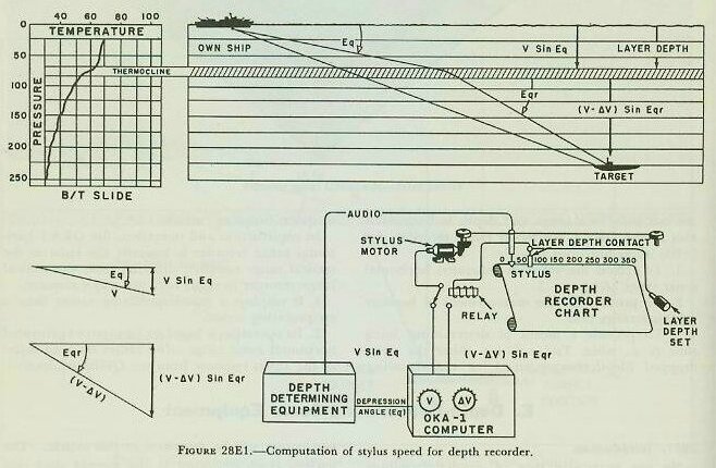 | E. Depth-Determining Sonar Equipment 28E1. Introduction No one particular type of depth-determining equipment will be described in this article. The various types employed at the present time (the QDA being an example) all have similar functions when used with the OKA-1 sonar-resolving equipment. That is, they- 1. Measure and transit to other units the value of sonar depression Eq. 2. Record and transmit to other units the value of target depth Hq. 28E2. Description Most of the depth-determining equipments now employed in the fleet use the same basic principle for computing target depth. This principle involves measuring the depression angle of the sound beam to the target, then resolving the speed of sound in water along that sound beam into its component in a vertical plane. Then this component of the velocity of sound in water is used to control the stylus speed of a recorder, with the excursion of the stylus starting at the instant the sound is transmitted into the water and the stylus marking a recorder paper when the echo is received. The recorder paper moves from one roller onto another, so that there will always be a new measurement of depth whenever an echo is received from the target on the depth-determining sonar equipment. The depth-determining sonar uses a tiltable transducer or a fixed transducer with a scanning receiving beam for measurement of the depression angle of the sound beam. If there were no refraction of sound in water, the sound beam would follow the straight line connecting own ship and target. However, as pointed out previously, temperature, pressure, and salinity differences will cause variations in water density which, in turn, will result in refraction of the sound beam. The effects of salinity and pressure variations are minor and will be neglected in this discussion. The effect of temperature variations, on the other hand, is appreciable and will be discussed in more detail. The temperature varies rather irregularly, due to currents and sea conditions. Generally speaking, however, it remains relatively constant down to a certain depth (known as the layer depth), then becomes rapidly cooler in a region known as the thermocline, and finally is relatively constant (but cooler) again until another thermocline is reached. The effect of thermoclines (i. e., regions of steep temperature gradients) upon sound beams is twofold. In the first place, because of the change in water density at the thermocline, sound beams other than those normal to the thermocline will be refracted downward (toward the normal) as they enter the cooler, more dense water. Secondly, the speed of sound is decreased upon entering the water of lower temperature. Because of these effects, the depth of the thermocline below the surface of the water (the layer depth) must be measured every few hours if accurate determination of target depth Hq is going to be possible. The measurement is accomplished by use of an instrument known as the bathythermograph (B/T). The B/T, which contains pressure- and temperature-measuring devices, is lowered over the side of a surface ship on the end of a long wire. During its descent it records pressure (which is a measure of depth) versus temperature on a slide which can be placed in a viewer and read when the B/T is recovered. |