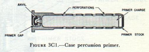 | 3C3. Case percussion primer This type is used in light and heavy machine guns such as the 20- and 40-mm. In ammunition for the smaller guns, which has a relatively small amount of propellant, the primer consists only of a cap, an anvil, and a percussion-sensitive mixture. The composition of the mixture varies with the amount of heat, flame, and sensitivity desired. In operation, the firing pin strikes the inverted cup which holds the primer cap. This indents the cup, forcing the cap against the anvil and exploding the pellet of initiating mixture. The resulting flame ignites the propellant. Where greater energy is required to ignite the propellant, the primer includes a black-powder charge which is ignited by the percussion cap. The 40-mm gun uses a primer of this type. See figure 3C1. |
