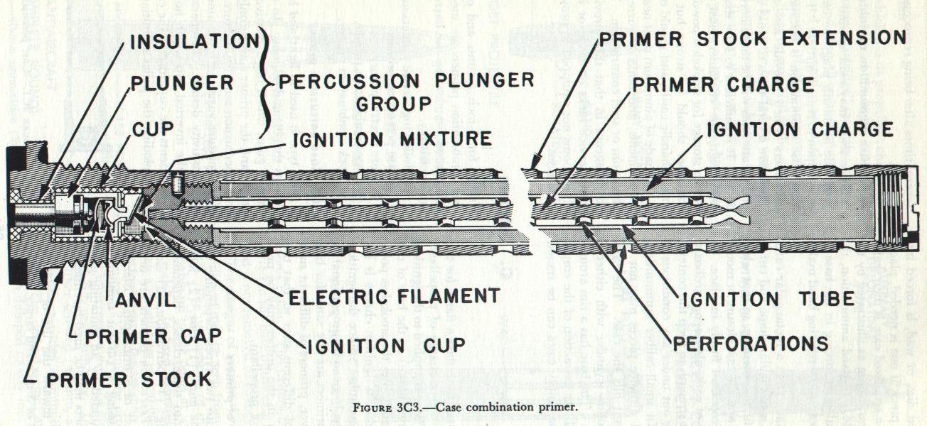 | The preparation of the case assemblies is comparable up to the point at which the mouth of a case is sealed. In fixed ammunition the projectile is the seal; a mouth plug is used in semifixed charges. There are four steps in the assembly of case ammunition: (1) priming, (2) loading the propellant, (3) fitting a wad and sometimes a distance piece, and (4) inserting the projectile or mouth plug. In priming, the primer used is either screwed (40-mm, and larger) or force-fitted (smaller cartridge ammunition) into the base of the case. The desired weight of smokeless-powder grains is then dumped loosely into the case. In 40-mm and larger guns, a cardboard disc, or wad, is forced into the case and a distance piece, if one is needed, placed on top. The mouth of a semifixed case is then sealed by the insertion of a mouth plug as illustrated by the 5�/38 case in figure 3B4. In fixed ammunition, the mouth of the case is sealed by forcing in the base of the projectile until the rear of the rotating band makes contact with the case. A distance piece is made from a rectangular cardboard sheet, folded into a triangular shape and cut to the length necessary to fit the assembly, so that when placed between the wad and the case closure or mouth plug, it will hold the propellant firmly in place. A case mouth plug may be of cork, plastic, or cardboard and must be of sufficient strength to keep the contents of the case from spilling out under any conditions of handling or loading. In small-caliber ammunition, the fitting of wads and distance pieces may not be necessary if the propellant fills the case. The cartridge case itself is a hollow cylinder with either a straight or a bottle neck. The base has a rim around its circumference to facilitate extraction of the empty case from the gun. The empty cases can be reused several times after being reprocessed at an ammunition factory. 3B6. Case ammunition containers Since leaks may exist around the primer and the projectile or mouth plug, the case cannot always be relied upon to remain airtight. Therefore like powder bags, case ammunition is transported and stowed in containers which provide air- and water-tightness. There are several types of tanks and boxes in service, and no attempts will be made here to describe them in detail. It is sufficient to state that regardless of varying design, the container must, above all, provide proper storage for smokeless powder. In addition, the container should be strong but not unduly heavy, should handle easily, and should open quickly. Metal tanks made of aluminum most nearly conform to these requirements, and tanks in current use are of either aluminum or steel construction. Metal tanks are also advantageous in that they provide good storage in ready service racks on deck, or in ammunition-handling rooms not equipped to provide the best storage conditions. C. Primers 3C1. General A primer is a device used to initiate a flame for the ultimate purpose of igniting a charge of propellant. In bag ammunition this flame is applied to the ignition pad (the auxiliary ignition charge) in the base of the powder bag, which in turn ignites the smokeless powder. In case ammunition the ignition charge is incorporated into the primer tube. Since the ignition charge incorporated in the bag can be proportional in size to the charge, the primers are the same for bag guns of all sizes. However, primers of different sizes must be used in cases of different sizes so that the amount of black powder in the primer may be proportional to the amount of propellant. 3C2. Types and classes of primers Primers are divided into two types, depending on how they are used in the gun: (1) case (2) lock. They are also divided into three classes, depending upon the method of firing: (1) percussion (2) electric (3) combination. Percussion primers are fired by the mechanical impact of a firing pin. Electric primers are fired by passing a current through a resistance filament surrounded by an initiating mixture. Combination primers may be fired by either of these methods. The current trend is toward the use of electric primers only, in case guns of 3-inch and larger caliber. Except for 5-inch mounts and older 6-inch turrets, case combination primers are used only in short cartridge cases for clearing the barrel after a failure to fire electrically. The following service primers are in current use: 1. Case percussion primer. 2. Case electric primer. 3. Case combination primer. 4. Lock combination primer. |