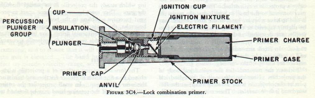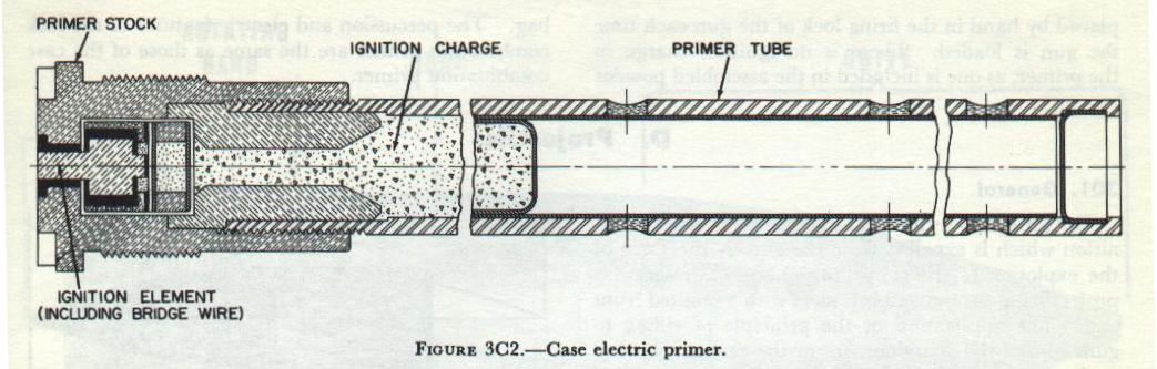 | 3C4. Case electric primer Case electric primers (fig. 3C2) are used for the newer 3-, 5-, 6-, and 8-inch guns. These primers contain an electric ignition element which consists of two resistance filaments connected in parallel and surrounded by an explosive mixture, and a small black-powder primer charge. An electric current heats the filaments, which then ignite the explosive mixture. Flame from the initiating mixture ignites the black-powder primer charge, which in turn ignites the main black-powder charge of the primer. |
