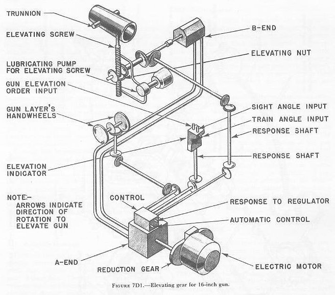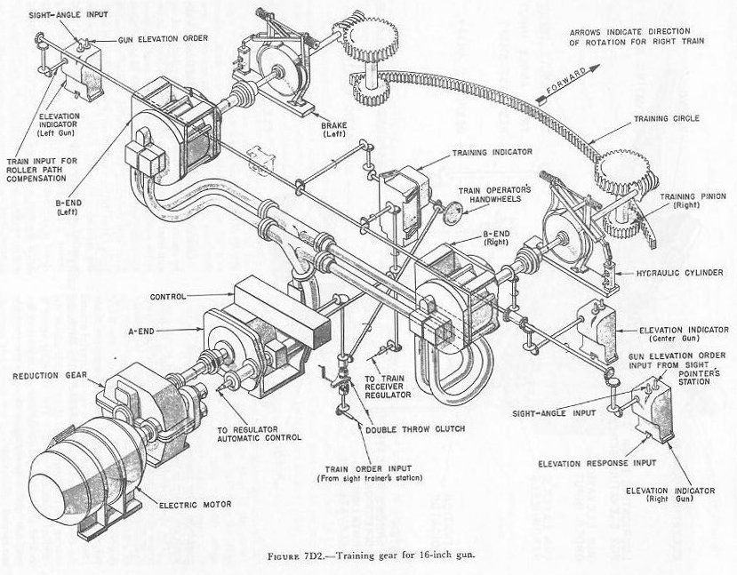 | 7D2. Training gear The training gear and its control equipment shown schematically in figure 7D2, also consists of an electric-hydraulic power drive which can be automatically or manually controlled. The electric motor (300 hp, with an overload rating of 540 hp) drives the A-end of the hydraulic transmission unit through a reduction ear. Two B-end units are driven by the single A-end. The B-ends drive, the training pinions, which mesh with the training circle secured to the turret foundation. The brakes between the B-ends and the pinions function to prevent the turret from turning when the training power is off. The brakes are set by springs and released by hydraulic cylinders. When power is off, no pressure is in the hydraulic cylinders, and the springs set the brakes. During training, a piston in each cylinder is forced upward by oil under pressure, releasing the brakes. Training may be automatically controlled from the director system through a receiver-regulator, or locally controlled from cither the gun deck or the machinery floor by handwheels. In indicator gun laying, either the train operator on the machinery floor trains the turret in accordance with dial-indicated train-order signals, received from the director system or turret sighting stations, or one of the sight trainers controls the drive by keeping his telescope on the target. 7D3. Sighting gear Each 16-inch turret has duplicate sight stations in enclosed compartments located outboard from the wing guns and approximately on the transverse center-line of the turret. Each station transmits gun elevation or gun train orders to the indicators and control gear on the machinery floor from which the power is actually applied to the turret and guns. The pointer's and the trainer�s telescopes are so mounted that they have parallel motions when the sight settings are made. Corresponding elements of the two stations are interconnected so that either station can take over sighting operations. When this is done, the guns are indirectly positioned from a sight station by first setting the sight. The pointer and trainer then turn their handwheels to keep the crosslines of the telescopes on the target. The pointer�s handwheel operates indicators at the gun layer�s station. By keeping a dial pointer matched with these indications, the gun layer positions the gun in elevation. The trainer�s handwheel can accomplish the same result in train. In addition it is possible, by use of appropriate selector, for the trainer in the gun house to bypass the trainer at the machinery level and move the turret directly in train, as he rotates his handwheel in keeping his vertical crosslines on the target. |