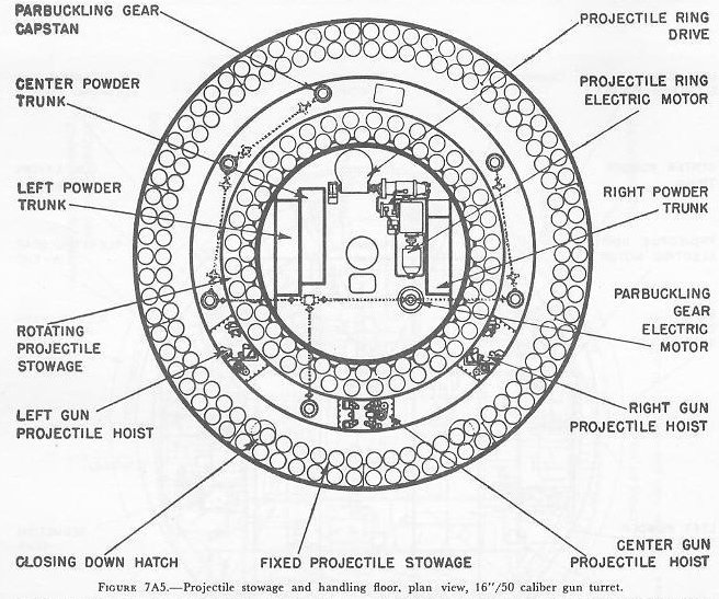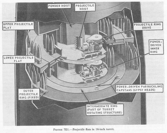 E. Ammunition Handling 7E1. Projectile stowage Projectile stowage in each turret is arranged in two circular compartments, called upper and lower projectile flats. Figures 7A5 and 7E1 show the arrangement of these flats. The projectile stowage spaces are between the turret foundation bulkhead and an inner concentric circular bulkhead. The latter bulkhead surrounds machinery compartments at the center of each flat and separates them from the stowage and handling compartment. In each stowage compartment the floor is subdivided into three concentric ring-shaped platforms. The outer ring is a fixed shelf attached to the turret foundation and provides the “fixed” projectile stowage. The intermediate ring is part of the rotating structure and is the shell-handling platform. The three projectile hoists have loading aperatures in this intermediate ring. The inner ring is a roller-mounted platform supported by the turret rotating structure and has a power drive which can rotate the ring in either direction with respect to the intermediate ring. This inner ring provides the “rotating” projectile stowage. |