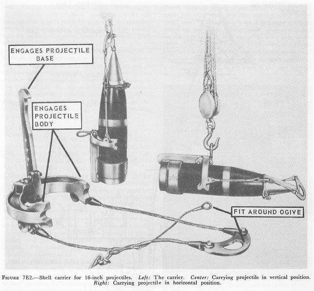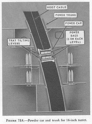 Projectiles are brought to these stowages as follows: First, they land on the main deck in a horizontal position and a shell carrier (on the left in fig. 7E2) is fitted around them. An electric drum-type hoist then lowers them in vertical position (center item in fig. 7E2) through hatches alongside the turret to the second platform level. Here they are transferred to an overhead trolley, from which they hang in horizontal position (on the right in fig. 7E2). The trolley takes them under a hatch in the projectile flat, where they are transferred to an electric whip hoist which hauls them (in vertical position) up to the projectile flat to be stowed. The projectiles are lowered and hoisted one at a time; when each projectile reaches the flat, its carrier is removed and sent up to the main deck to be used again. The projectile’s are stowed standing on their bases, and each is separately lashed to the bulkhead. |