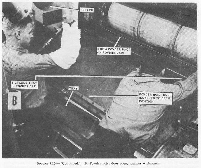 The rammer chain forms a rigid column when it is extended. The chain assembly, including the head link buffer, is about 25 feet long. When in the “ready to ram” position the ramming head is about 8 inches behind the projectile base and 9 feet from the breech face. The projectile travel to full seat during ramming is about 19 feet. 7E5. Powder hoist The powder magazines are outside the turret foundation on the platform deck beneath the lower projectile fiat. The powder is passed manually through self-closing scuttles in the powder-handling room bulkheads and in the lower foundation, into the hoist-loading space around the lower end of the turret revolving structure, and delivered by hoists to the guns. An electric-hydraulic powered hoist is provided for each gun. Each hoist contains a powder car (fig. 7E4) which rides up and down like an elevator in a closed, inclined trunk which extends through the turret structure from the hoist-loading space to the turret roof. The car is a large box-shaped structure closed on three sides. Four guide wheels, mounted on the rear corners, ride along the after side of the trunk. The bags are carried on two vertically spaced trays which can be separately tilted by means of hand levers on one side of the car, A loaded car delivers a full-service charge of six bags to the gun without intermediate handling. The car is loaded in the hoist-loading space beneath the projectile flats, through an aperture in the trunk. This opening is sealed by a manually operated, vertically sliding door which must be closed before the car can be hoisted or lowered. It cannot be opened unless the car is in its loading position. Powder is delivered to the gun through a door located just abaft and to one side of the breech mechanism. The door swings outward and down, providing a shelf across which the powder bags roll from the car to the loading tray. (Fig. 7E5.) The door is operated by a hydraulic power device. When the delivery door is open, the car can be lowered, but not raised. The interlocking features make it impossible to have both the loading and the delivery doors open at the same time. The hoist power unit consists of an electric motor (100 hp) and a conventional hydraulic speed gear that drives a hoisting drum. This unit is located in the gun compartment next to the trunk. The ca r is lowered by gravity and hoisted by means of a 5/8-inch diameter wire rope which passes over a sheave under the turret top plate and thence to the hoisting drum. The hoist control is located at the hoist operator's station near the top of and abaft the trunk. Control arrangements include visual powder hoist indicators, starting and control selector levers, devices which limit acceleration and deceleration rates, door interlock switches, safety car-stop operating devices, and a power-failure brake on the hoist drum. The latter prevents the car from falling in case of power failure or rupture of hydraulic leads. 7E6. Loading operation A 16-inch 3-gun turret can be operated with a minimum crew of 77 men inside the turret. Station assignments for the turret crew are ordinarily as listed in the accompanying table. Station assignments, Turret crew .......Station.........................................................................Location Turret officer................................................Rangefinder and Turret Officers compartment. Turret officer's talker.....................................Rangefinder and Turret Officers compartment. Turret captain...............................................Rangefinder and Turret Officers compartment. Computer operators (2)..................................Rangefinder and Turret Officers compartment. Rangefinder operator.....................................Rangefinder and Turret Officers compartment. Rangefinder pointer.......................................Rangefinder and Turret Officers compartment. Rangefinder trainer........................................Rangefinder and Turret Officers compartment. Talker..........................................................Rangefinder and Turret Officers compartment. Sight trainer, right.........................................Right sight station Sight pointer. right........................................Right sight station Sight setter. right..........................................Right sight station Sight trainer, left...........................................Left sight station Sight pointer, left..........................................Left sight station Sight setter, left............................................Left sight station Plugmen (gun captains) (3)...........................Gun rooms Cradle operators (3).....................................Gun rooms Rammer operators (3)..................................Gun rooms Primermen (3).............................................Gun rooms Powder-hoist operators (3)...........................Top powder trunks. Gun layers (3)..............................................Machinery floor Gun train operator........................................Machinery floor Projectile hoist operators (3)..........................Projectile-handling floor (each level) Projectile-ring operator..................................Projectile-handling floor (each level) Shellmen (9).................................................Projectile-handling floor (each level) Electrician....................................................Projectile-handling floor (each level) Shell-deck P. O............................................Projectile-handling floor (each level) Powder-door operators (3)............................Powder-handling floor. Powder passers (9).......................................Powder-handling floor. Handling-room P. O......................................Powder-handling floor. In addition there are 6 powder passers in the annular space between the powder-handling room and the magazines, and 12 powder passers in the magazines. With the turret in a