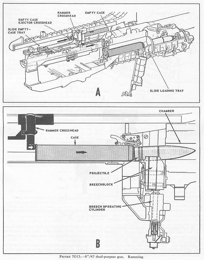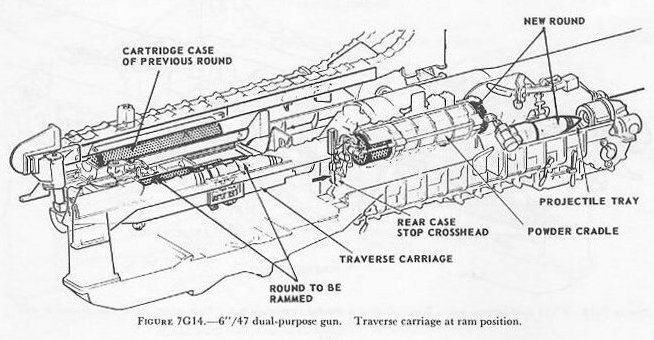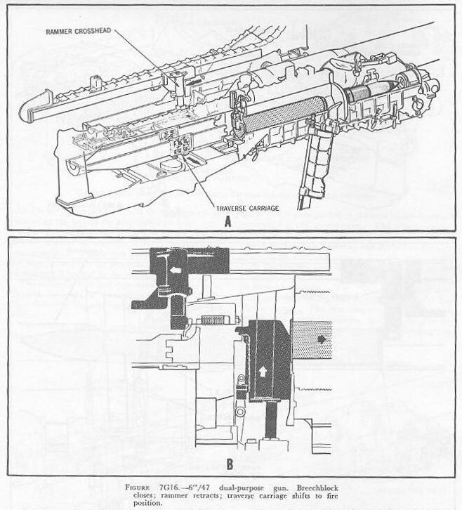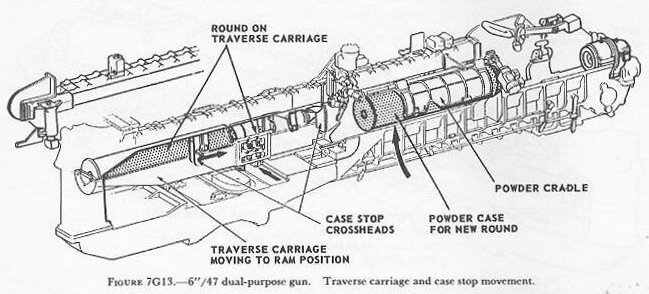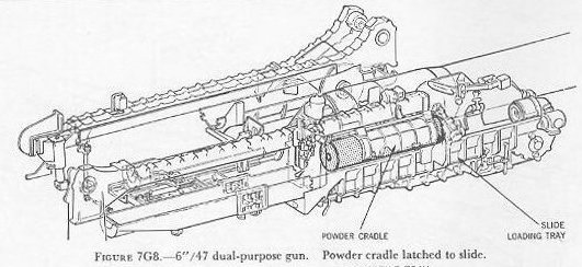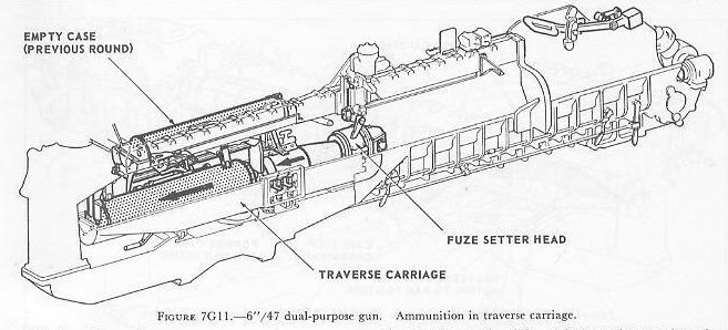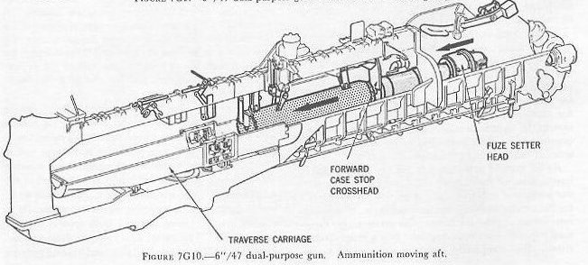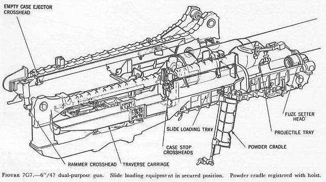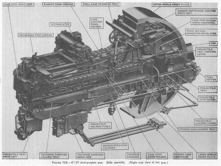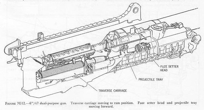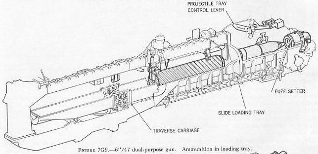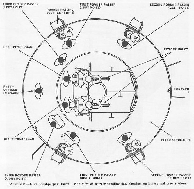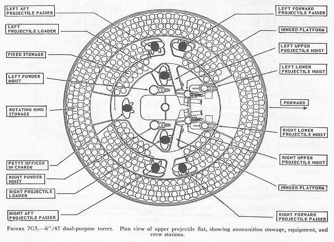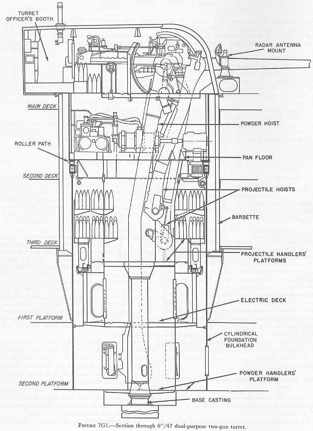 | 7G6. Ammunition hoists Each gun is served by three ammunition hoists: one powder hoist, and two projectile hoists (one projectile hoist from each of the two projectile flats). The powder hoist delivers the powder cartridge directly to the gun slide completely automatically, regardless of the movement of the gun in elevation, without manhandling of the case, and without requiring that the gun be brought to a specific loading position. The projectile hoists bring the projectiles to a point adjacent to the slide, from which they are manually transferred to the gun slide. Projectiles can be loaded at any gun elevation. All six ammunition hoists are generally similar. All are of the continuous type in which an endless-chain conveyor, operating intermittently, automatically starts hoisting every time the hoist lower end is loaded, until the hoist is full. Each hoisting cycle lifts the projectile or powder case one stage. The hoists can also be reversed for lowering ammunition. The powder hoist lower end is fitted with a flameproof scuttle for extra safety. The upper end terminates in a power-driven cradle which automatically loads the propelling charges into the gun slide. 7G7. Fire control and power drive equipment The 6�/47 dual-purpose turret is designed to deal with air as well as surface targets. It is capable of a maximum surface range of over 25,000 yards, and can reach targets at an altitude of over 51,000 feet when at its maximum elevation of 78�. There is no optical rangefinder in these turrets, but they are equipped with telescopic prismatic sights, periscopes, and sight-setting equipment, as well as radar and computer equipment. The turret is driven in train and the guns in elevation by electric-hydraulic power drives controlled by receiver-regulators. The fuze setters on the gun slides are also operated by receiver-regulators. There are six designated types of turret control: 1. Primary surface control. The gun and turret drives are controlled by an aloft radar antenna mount or by an aloft main-battery gun director, operating in conjunction with main-battery plotting room equipment. This control has two variations: �AUTOMATIC� and �INDICATING.� 2. Primary AA control. The gun and turret drives are controlled by an aloft main-battery gun director operating in conjunction with main-battery plotting-room equipment. This control has two variations: �AUTOMATIC� and �INDICATING.� 3. Secondary surface or AA control. The gun and turret drives are controlled by a 3-inch battery director. 4. Local radar control. The drives are controlled by the radar equipment within the turret. In this method of control, the pointers control gun laying with their sights and handwheel controls: Turret train is controlled by the radar operators using the train transmitter (turret order) to send gun train orders to the receiver-regulator and to the gun train indicators. 5. Hand control. The gun-laying and training drives are controlled by the pointers and selected trainer using their sights and handwheel controls. In primary surface or AA control, the turrets and their guns are controlled, in automatic control, by signals received from the controlling plotting room. Or they may be controlled and positioned in the follow-the-pointer operation, called indicating control. Either selection can be controlled from the forward or after plotting room, using any one of the aloft radar antenna mounts or main-battery directors for surface control, or using any one of the main-battery directors for AA control. In secondary surface or AA control, the turret drive may be controlled by similar automatic and follow-the-pointer (indicating) control variations from a selected secondary (3-inch battery) director. Turret local control methods include local radar control, hand (target-sighting) control, periscope control, and combinations of these. All of these methods use the local computer for solution of the firing problem for the proper sight angle and sight deflection for hitting the target. The computer operator gives the computed values of sight angle and sight deflection to the sight setters. The sight setters crank these quantities into their indicators to set the sights to the ordered values of sight angle and deflection. Radar control arrangements are one of the feature innovations of the turret. The installation includes one complete radar control set in the turret officer�s booth, a radar antenna, and antenna train drive. This installation enables the turret to ascertain target direction, distance, course, and speed. It is a range-finding system that completely displaces the optical range-finder of earlier turret design, and provides new alternative methods for local control. The radar signal beam to the target can be employed to yield line-of-sight and range data. Unlike other 6-inch turrets, the elevating gear is of the arc and pinion type (same principle as the 5�/38 mount) instead of the screw and nut type (like that in the 16�/50 turret). 7G8. Other facilities The 6�/47 dual-purpose turret is fitted with the usual electrical illumination, power, data-transmission, alarm, signal, and communications circuits. It is equipped with 2 compressed-air pipe systems-one a 125-psi system for supplying air to the gas ejector and sprinkling systems, and the other a 3,000-psi supply for the counterrecoil air-replenishing system for replenishing accumulator air, and for charging the emergency air flasks. The turret also has 2 self-contained exhaust systems for the empty-case ejectors and 2 ventilating systems which supply air under forced draft to all turret levels. It is equipped with an elaborate sprinkling system which can spray water at all ammunition stowage points as well as in the ammunition hoists and at the gun breeches. The sprinklers are supplied with water under pressure, and function either automatically in case of fire, by remote control from several stations, or manually. The turret 