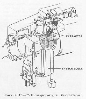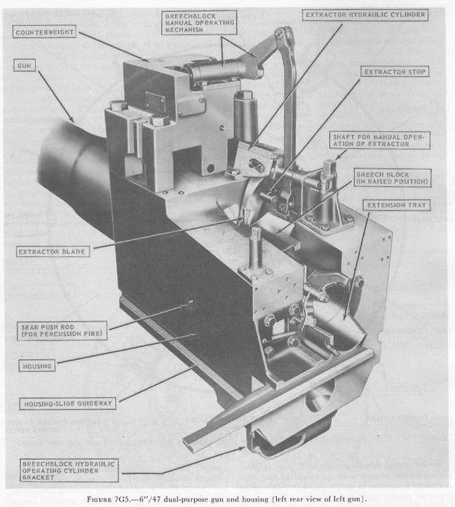 | 7G4. Gun assembly The right- and left-hand gun assemblies are functionally identical, though some parts are of opposite hand. The two gun assemblies are symmetrically arranged about the turret centerline. The 6�/47 gun used in these turrets is a mon�bloc radially expanded type, designed for semifixed ammunition, whose bore has 48 rifling grooves with right-hand uniform twist, 1 turn in 25 calibers. The gun housing has a vertically sliding breech-block operated by a hydraulic cylinder, and a single spade extractor, also hydraulically operated (fig. 7G5). |