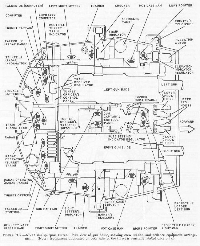 | 7G3. Arrangement of turret personnel and equipment Figure 7G2 shows the arrangement of ordnance equipment and crew stations in the gun house of the 6�/47 turret. All units of both guns, except the forward portions of the barrels and the power plants for the slide power equipment, are located in the gun house. (The slide equipment motor-pump units are located on the next level, the pan plate.) Also located in the gun house are the upper ends of the 6 ammunition hoists, 2 fuze setting indicator-regulators, all components of the 2 elevating-gear drives and their indicator-regulator controls, and the 2 gun captain�s control panels. Other major units in the gun house are the components of the fire control equipment. These are grouped into three stations: the right and left wing stations (also called sight stations) and the turret officer�s booth. The right wing station includes controls for the turret trainer and for the right gun pointer and sight setter; the left station includes controls for the checker (standby turret trainer) and for the left gun pointer and sight setter. The turret officer�s booth includes the controls for the turret officer, turret captain, radar control operators, and computer operator. Almost all of the equipment is mounted either on the forward bulkhead or on the after wall of the booth. Twenty-one members of the crew are located on the shelf plate of the turret; 10 in the turret officer�s booth and 11 in the gun house. These comprise 11 turret controlmen, 3 gun-laying operators, 3 gun operators, 2 hot-case men, and 2 projectile loaders. The 11 turret controlmen are: the turret officer, the turret captain, the talkers, the radar operators, computer operator, and two sight setters. The checker, a member of the crew in training operations only, does not man his station in battle action. The three gun-laying operators are the right and left pointers, and the trainer. The 3 gun operators are the 2 gun captains, 1 for each gun, and the gunner�s mate repairman, stationed in the turret officer�s booth for general maintenance of the gun control equipment. His principal responsibility is trouble correction; he also aids in preparing the guns for firing, in maintaining continuous operation of the guns, and in stowing the guns. The 2 projectile loaders are located 1 at the loading tray of each gun. They operate the fuze setting indicator-regulator when the fuze setting system is in manual control. The 2 hot-case men are located 1 on the outboard side of each gun near the case ejector. The pan plate (not illustrated) contains most of the components of training gear drive and the hydraulic power supply for the slide power equipment, as well as some of the equipment for the hoist power drives. |