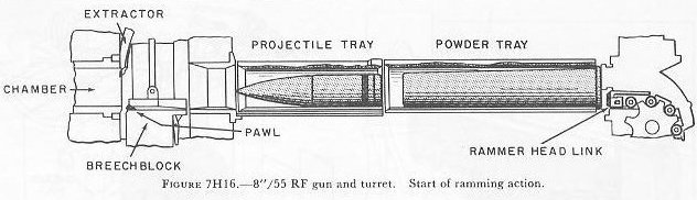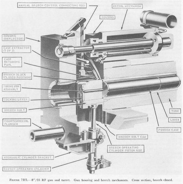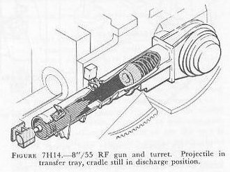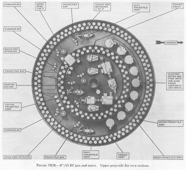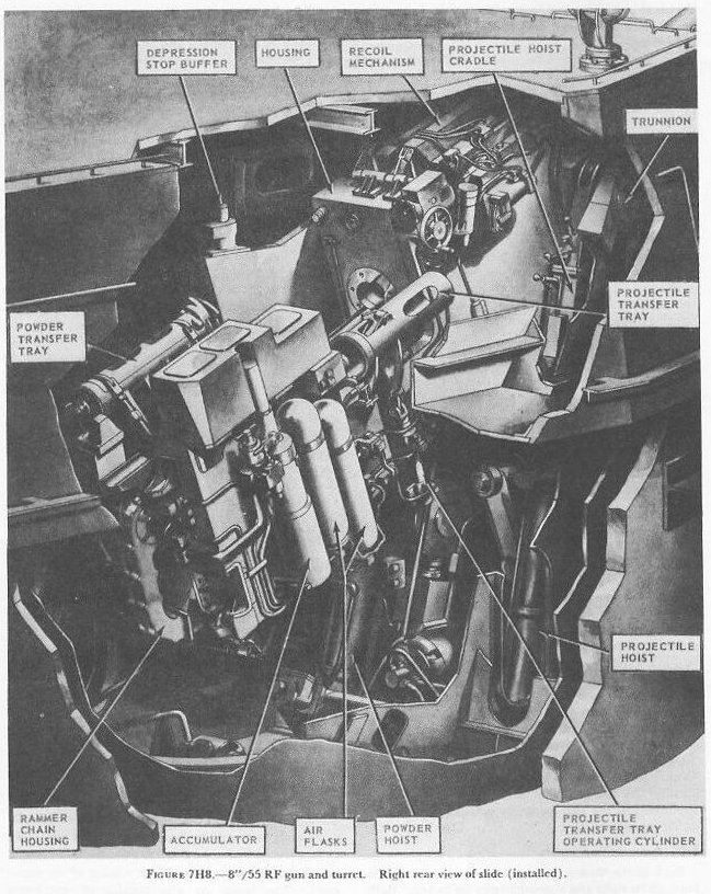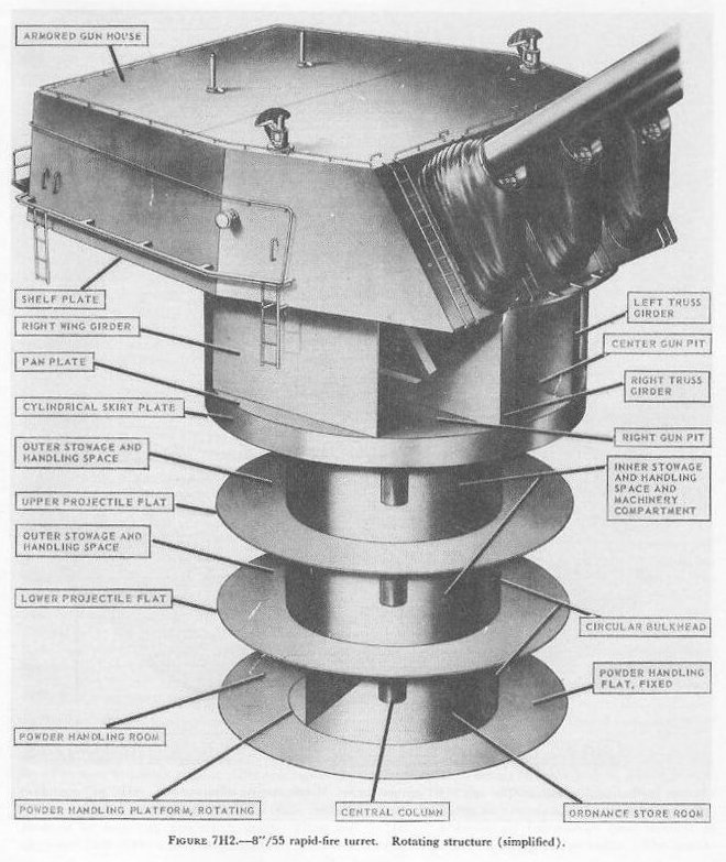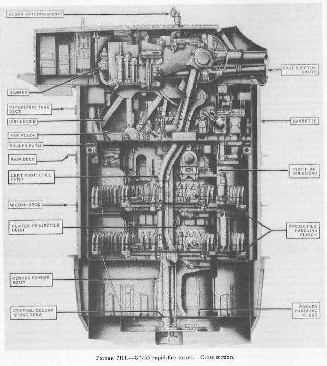 | H. 8�/55 Rapid-Fire Gun and Turret 7H1. General At the present time the closest approach to the completely automatic turret described earlier in this chapter is the 8-inch 55-caliber rapid-fire gun and turret. These are the largest United States naval weapons now in service using case ammunition. Three such turrets are installed on Salem class heavy cruisers. In this type of 8-inch turret, structural and space arrangement plans differ substantially from those of bag-gun turrets like the 16-inch turrets taken up earlier in this chapter. They are equally different from 8-inch bag-gun turrets on cruisers of similar type (for example, Baltimore class). This difference is due in part to the use of case-type ammunition, and in part to the design types and details of the guns and ammunition-handling equipment. The ammunition and equipment designs do not require flameproof bulkheads separating the guns, the control stations, and the powder service. The foundation structure, barbette, and magazine designs are quite similar to those of earlier heavy cruisers, differing principally in the magazine stowage provisions and powder-passing scuttles for powder cases instead of powder bags. In their ordnance feature, however, the turrets are entirely new. The guns operate automatically, and require no attendants in the gun compartment. They fire at three times the rate of the comparable 8-inch three-gun turrets of the Baltimores. Other features are: comparatively fast gun laying and turret train drives; loading at all angles, while gun laying; substitution of radar range-taking equipment for optical rangefinder; automatic fuze setting; local radar control; and other flexible fire control arrangements for local and remote control. Because it uses case-type propelling charges, many of the flameproof integrity construction features are eliminated-unlike the Baltimore class bag-gun turret of the same caliber, the powder hoist system is single-stage and the gun deck is not compartmented, though scuttles separate the handling room from the magazine. Because the guns use case ammunition, there is a case-ejection mechanism- a continuous-chain conveyor unit below the slide which pushes the cases out an empty-case tube under the gun. The training mechanism of this turret is of the usual type, but it has an arc-and-pinion type of elevating gear instead of the elevating-screw type. As to ammunition-handling facilities, the projectile flats each have two projectile rings, plus an improved type of parbuckling mechanism. Moreover, the guns incorporate completely mechanical ammunition-handling arrangements that make it unnecessary for the crew to handle or even touch the ammunition, once it has been loaded into the hoists. 7H2. Structure and space arrangement As with earlier designs, the fixed-turret structure includes a foundation which supports a roller path, and an armor barbette which protects all levels of the turret between the armor deck and the gun house. The rotating structure is topped by a gun house; under this, the levels are the pan plate (which forms the bottom of the gun pits), two projectile flats, and a powder-handling room. There is no separate electric deck; the equipment that usually occupies such a deck is mostly inside the circular bulkheads that enclose the central part of the turret at the projectile-flat levels (figs. 7H1 and 7H2). |