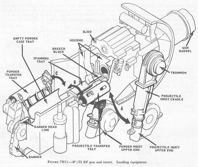 | Figure 7H10 illustrates the projectile ring and par-buckling gear layout in the Salem class turret. Much of the gear crowding the interior of this turret is not shown in the illustration. Inside the turret foundation bulkhead are: 1. The outer projectile ring (capable of independent rotation and powered by an electric-hydraulic drive). 2. The outer projectile-handling platform (part of the turret rotating structure) on which are mounted the right and left projectile hoists, and the 3 gypsy heads and 2 steady arm mechanisms (1 for each projectile hoist) used in parbuckling. 3. The inner projectile ring (independently driven by an electric-hydraulic power drive). 4. The central part of the turret rotating structure, with the center projectile hoist and its steady arm, the power hoists, the central column, and various other gear. Only the two projectile rings are used for projectile stowage. 7H9. Gun-loading equipment Most of the loading machinery that serves ammunition to the 8-inch RF gun is shown in figure 7H11. The projectile-hoist cradle, which receives the projectile from the projectile hoist, can swing up and down (arrow A) between its hoist or receiving position (aligned with the hoist), shown in the figure, and its discharge position, aligned with the tubular projectile transfer tray. The projectile-hoist cradle is rotated on a journal bearing surrounding the trunnion by a hydraulic cylinder (shown in fig. 7H9). The cradle locks in either position, regardless of gun elevation angle, and regardless of whether or not the gun is moving in elevation. There is a similar powder-hoist cradle (not shown in the figure) on the left trunnion, which has similar positions with respect to the powder hoist and the powder transfer tray. The powder transfer tray and projectile transfer tray, when swung outboard as in figure 7H11, are in firing position. These trays can swing (arrows B, C) inboard, under the thrust of hydraulic cylinders (the cylinder for the projectile tray is visible in figure 7H8) to ramming position, in which they are aligned with each other, with the gun breech, and with the rammer. When in firing position, the trays allow clearance for the gun to recoil and for the ejected cartridge case to move along the spanning tray into the empty powder-case tray. Note that the spanning tray, which is structurally a part of the housing, moves in recoil with the housing under the empty powder-case tray, which remains stationary. |