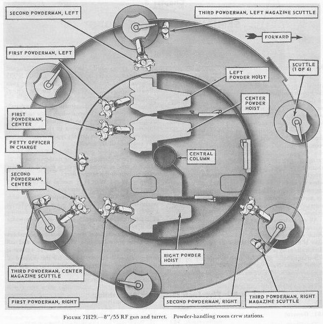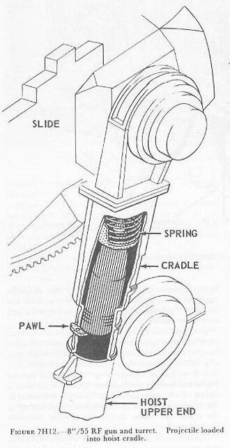| The upper end of each hoist terminates in a cradle-a tubular unit suspended from a journal on the slide trunnion and arranged to swing between the top of the hoist and the side of the slide. In this swinging movement the cradle lower end is guided by a curved rail (not shown in the figures) mounted on the gun girder. When the cradle swings up to the slide, it latches there and moves with gun-laying action until the projectile or powder case is ejected. Then it moves to the hoist, and latches in alignment with the hoist tube, permitting the hoist to feed it another projectile or powder case. Each cradle has a pawl at its open end and a large spring-ram device at the trunnion end. When the hoist lifts a projectile into the cradle, the spring ram is compressed and a pawl latches the projectile so that it cannot move out unless the pawl is depressed. A remotely controlled fuze setter is located in the projectile cradle. The powder hoist has, at its lower end, a flameproof scuttle consisting of a revolving cylinder with two compartments 180� apart. When one compartment faces into the hoist tube, the other faces outward. An electric drive controlled by a crewman rotates the cylinder 180� when a powder case has been loaded into the outer compartment, to transfer the case in-ward to be hoisted. 7H8. Ammunition-handling operations Each 140-pound metal powder case contains the complete propelling charge for an 8-inch gun. The cases are moved in small trucks, rather than by hand carrying. The powder-handling room is not divided by flame-tight bulkheads, but forms one large enclosure. Propelling charges are transferred from the magazine through the powder-handling room bulkhead by rotary scuttles. Crewmen load the charges into hand trucks, push them to the hoists, and unload them into the rotary scuttles (described in a previous paragraph) at the powder-hoist lower ends. The projectile hoist can be loaded at either projectile-flat level. Projectile hoist operation is normally completely automatic. Loading the hoist automatically starts its hydraulic drive to raise the ammunition one flight (if the empty cradle is waiting at the upper end). The hoists are also capable of emergency manual control and can be used for lowering ammunition. |