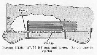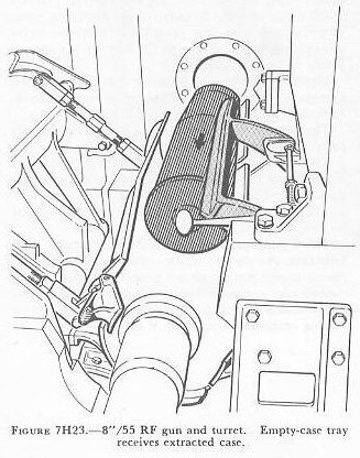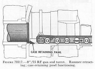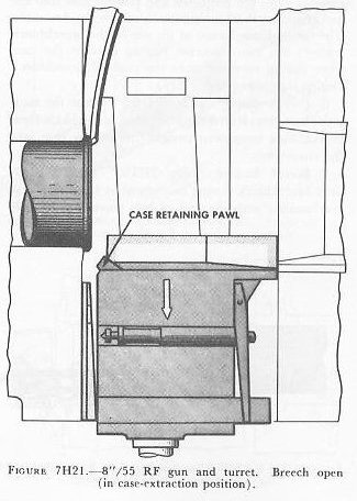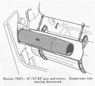 | 9. Gun recoil, gun counterrecoil, and breech opening. During counterrecoil a cam in the slide causes two push bars to rotate the gear in the block and retract the breech bolt (fig. 7H20). This retracts the firing pin, unlocks the block, and causes the breechblock cylinder valves to port hydraulic fluid into the cylinder to lower the block. 10. Case extractor operation. As it nears full open position, the breechblock actuates a valve that admits hydraulic fluid to the extractor hydraulic cylinder. In full open position, the top of the breechblock is below the path of the empty powder case when it is extracted (fig. 7H21). Both extractors move to extract the case and eject it to the rear (fig. 7H22). Then they retract. 11. Gas ejector operation. When the case extractors are actuated, a mechanical linkage (not illustrated) opens the blow valve of the gas ejector. This ports air via the pilot valve to three orifices in the breechway. The air automatically shuts off. 12. Breechblock to loading position. The breech-block moves upward approximately 0.75 inch to gun-loading position. 13. Empty-case tray operation. As the empty case comes out of the chamber (fig. 7H23), the guide keeps it from being thrown out of the slide. The hydraulic buffer takes the impact of the case, and the two retaining latches (one is shown in the figure) hold it in place in the empty-case tray. By now the powder and projectile trays have been reloaded. Arrival of the empty case in its tray actuates 1 of a series of interlocked electric switches, and the 2 reloaded trays move toward ramming position once more, ready for the next shot. As the powder-case tray swings downward, so does the empty-case tray (fig. 7H24). The case-retaining latches are cammed open, and the empty case is dumped into the case-ejection mechanism under the gun slide. 14. Case ejector action. The case ejector consists principally of a sprocket-driven endless chain with two equally spaced pawls, and a tube leading outside the turret under the gun, with a spring-loaded door at its end. When the empty case lands on the ejector, it depresses a pawl which closes a switch; this causes the case-ejector drive to move the chain forward one flight (one-half the length of the chain) (fig. 7H25). As the chain moves forward, 1 of its 2 pawls pushes the powder case into the tube. Since the capacity of the empty-case tube is only five cases, eventually the cases at the front end are ejected past the door out to the ship�s deck (fig. 7H26). A special drain disposes of sea water that may be shipped in heavy weather while the door is open. 7H11. Training and elevating gear The guns of this turret are laid by arc-and-pinion type elevating gear. The training gear is similar to that of other turret installations. The training units include the training gear electric-hydraulic drive equipment, a train receiver-regulator, and control station equipment for the turret training system. There are 3 elevating gear assemblies, 3 gun elevation indicator-regulators and power drives, and 1 pointer�s control station equipment for the gun elevating system. Turret training and gun laying are controlled much as in the 6�/47 dual-purpose turret described earlier in this chapter. The pointer�s and trainer�s control equipment provides for three methods of control- automatic, local, and hand. In automatic, the electric-hydraulic train and elevation power drives are under the immediate control of the fire control directors, or some other source of gun order signals. In local, the power drives are controlled through the receiver-regulator or indicator-regulators by the trainer�s and pointer�s handwheels. In hand control, the receiver-regulator and indicator-regulators are bypassed, and the trainer�s and pointer�s handwheels directly control A-end tilt to regulate the functioning of the elevating and training power drives. 7H12. Fire control In general, fire control arrangements are quite similar to those possible with the Worcester class 6�/47 turrets described in the preceding section. The turret battery can be controlled by main-battery directors through forward or after plot, or by the secondary-battery directors. Turrets II and III have their own radar equipment for determining target location, including range. Turret II can function to aim the guns of turret I. (This is called �hi-turret� control, because turret II is several feet higher than turret I.) Each turret can also function in local control. 7H13. Crew stations and operations Forty-four men are required to man the battle stations of this turret installation. Twenty-seven men of this complement, located in the levels below the gun house, operate the ammunition service to the guns; six others, stationed in the gun house, control and maintain gun operations; these 33 men are identically employed in all methods of turret control. The balance of the organization consists of 2 gun-laying operators and 10 turret controlmen, all stationed in the gun house. These 12 men have varying duties, depending on the method of control. In this installation, in fully automatic operation, the operations of the guns are controlled from the turret officer�s booth in the rear of the turret from control panels and switchboards. Eighteen members of the crew are located in the gun house. (fig. 7H27). There are 10 turret control-men, 2 gun-laying operators and 6 gun operators. The 10 turret controlmen are the turret officer, turret captain, computer operator, 2 radar operators, 3 talkers, sight setter, and checker. The checker is a member of the crew in training operations only; his station is not manned in battle action. The two gun-laying operators are the pointer and trainer. The 6 gun operators are the 3 gun captains, their assistants, and the electrician. This electrician is stationed in the gun house for general maintenance of control and communications circuits. His principal responsibility is trouble correction and ai