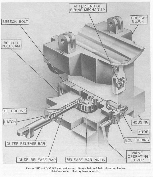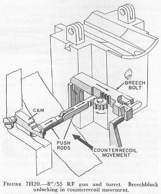 | 7H4. Gun supporting elements The gun supporting structures are of the usual turret type-gun girders (fig. 7H2) which support the deck lugs (fig. 7H4) into which the gun slide trunnions fit. The slide trunnions pivot in roller bearings in the deck lugs (fig. 7H4). The trunnion arrangements of the slide include journals for mounting two cradle units. These are the upper ends of the ammunition hoists. 7H5. Gun housing and breech mechanism Figures 7H5 and 7H6 illustrate the anatomy of the housing and breech mechanism with the breech open and closed. The gun housing is a rectangular alloy steel forging. It is attached to the gun shoulder and rear cylinder by a bayonet-type joint. The housing has vertical guide ways for the breechblock. The guides have a slight forward slope to make the breech-block seat the projectile as it rises. The breech mechanism consists of a vertically sliding power-operated breechblock, an electric firing mechanism, a power-operated mechanical case extractor, hydraulic cylinders and valves to drive these components in normal breech operation, and manually operated mechanisms to supplement the power system. The breechblock is a rectangular steel forging similar in general design to other vertical sliding breech-blocks. Its top surface has a longitudinal concave area that forms an extension of the ramming tray (fig. 7H6). A horizontal fore-and-aft bore through its middle houses the firing pin assembly. The breech-block is moved vertically in the housing ways by a hydraulic cylinder. When closed (top position, as in figure 7H5), it is locked by a spring-loaded rectangular bar-the breech bolt. |