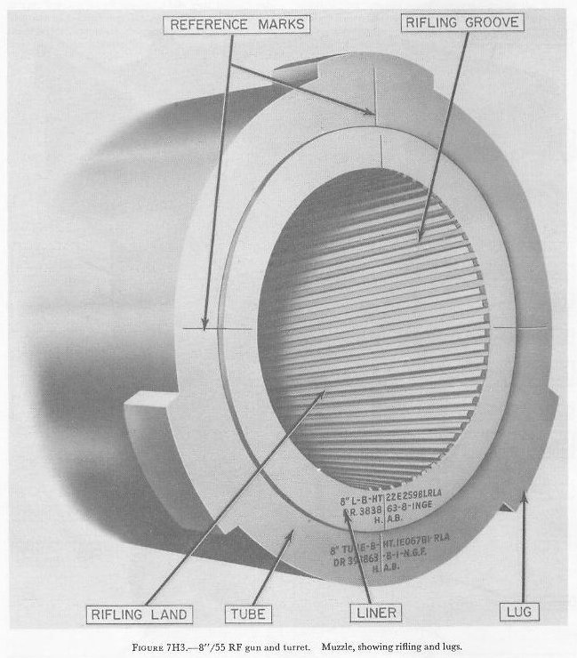 | 7H3. Gun The gun is a combination type, 2-piece, 8-inch 55-caliber design consisting of a tube and rifled liner. It is a �loose� assembly. The liner is fitted for convenient removal and replacement on board ship. It is designed to withstand a pressure of nineteen long tons per square inch. Its rifling is of uniform right-hand twist with 64 grooves and 1 turn in 25 calibers. The powder chamber and breech are designed for semi-fixed ammunition. Figure 7H3 shows the muzzle details, including the three Jugs which anchor the jacks that are used to haul out the liner for replacement. |