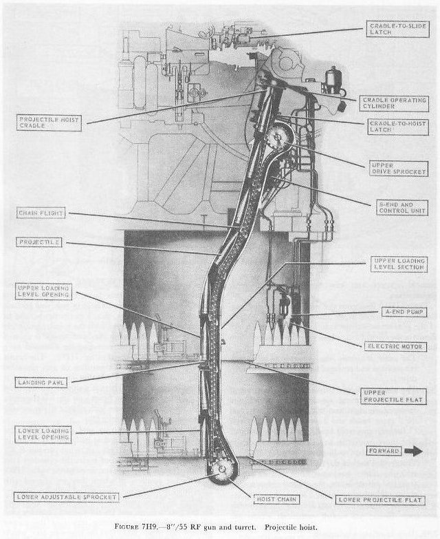 | 7H7. Ammunition hoists Each of the three guns of the turret has a projectile hoist on its right and a powder hoist on its left. Both kinds of hoist are of the electric-hydraulically driven endless-chain and sprocket type, and in principle resemble the dredger hoist used in 5-inch mounts. Since the projectile and powder hoists are similar in general construction and principle, only the projectile hoist is shown in the figures (fig. 7H9). |