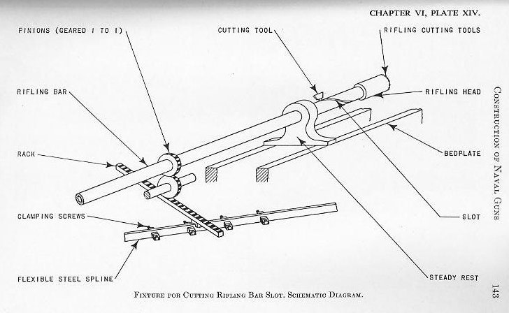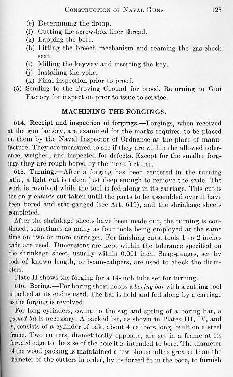 HOME INDEX Furnace Practice Ingots Whitworth Process Forgings Tempering and Annealing Testing Machines Summary of Steps of Manufacture of Built-Up Guns Turning Boring Indicators Bore Searching Star Gauge Shrinkage Assembling the Gun Shrinkage Pit Assembling the Parts Lining the Gun Finishing the Gun Final Turning Rifling Determination of Droop Chasing Thread for Screw-Box Liner Lapping Fitting the Breech Mechanism Milling the Keyway Putting on Yoke Final Inspection |